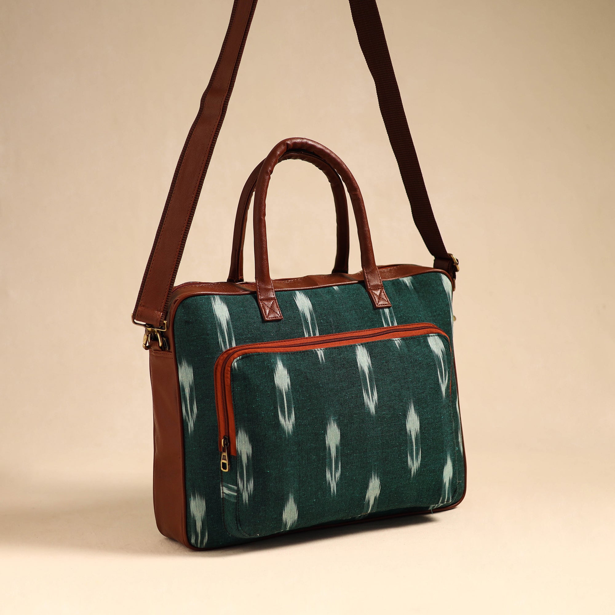 This green handmade pochampally ikat cotton laptop bag with an adjustable side strap and detachable sling is designed to protect and carry your laptop with ease and style. Crafted from durable artificial leather and adorned with pochampally Ikat cotton fabric, The interior boasts an eva sheet, ensuring optimal protection. With laptop compartment, two simple and one zipper pocket on the inside, and one zipper pocket outside, there is ample space to keep your laptop and other essentials organised. Embrace a perfect fusion of fashion and utility with this uniquely designed laptop bag.