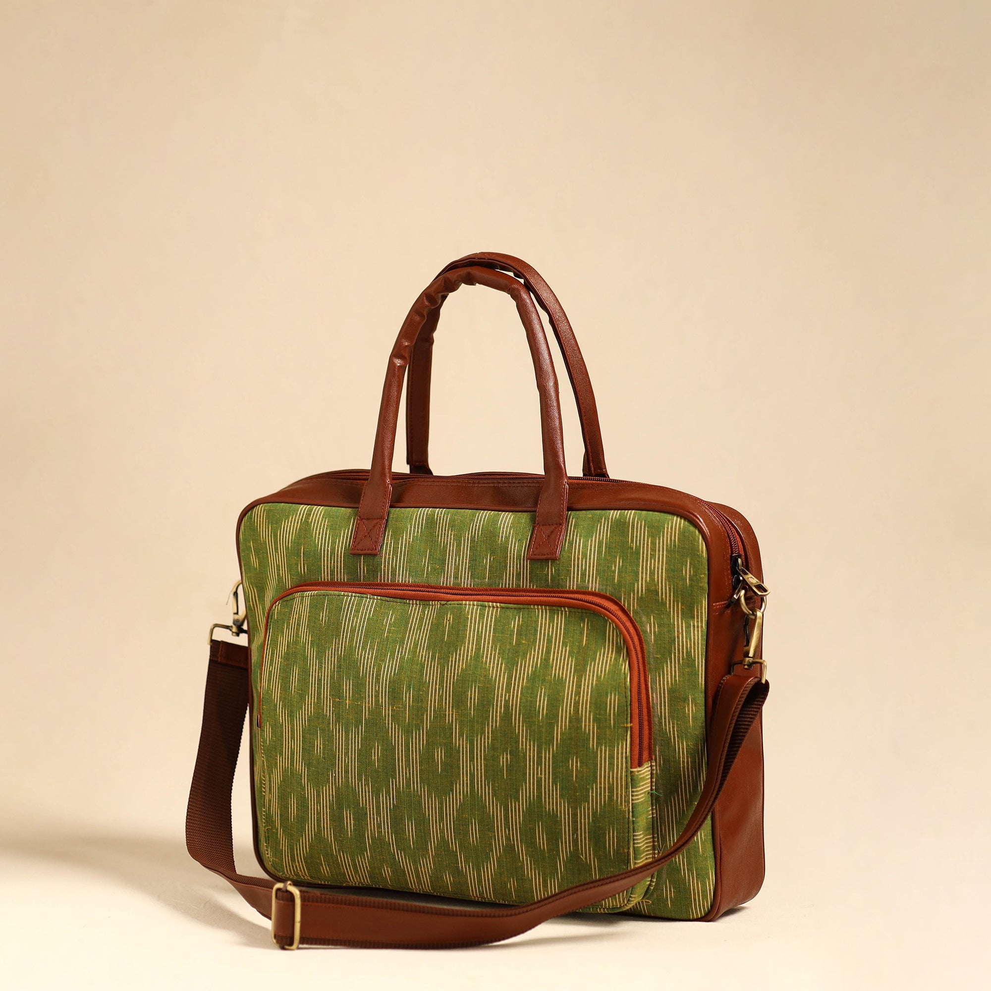 This handmade green pochampally ikat cotton laptop bag with an adjustable side strap and detachable sling is designed to protect and carry your laptop with ease and style. Crafted from durable artificial leather and adorned with pochampally Ikat cotton fabric, The interior boasts an eva sheet , ensuring optimal protection. With laptop compartment, two simple and one zipper pocket on the inside, and one zipper pocket outside, there is ample space to keep your laptop and other essentials organised. Embrace a perfect fusion of fashion and utility with this uniquely designed laptop bag.