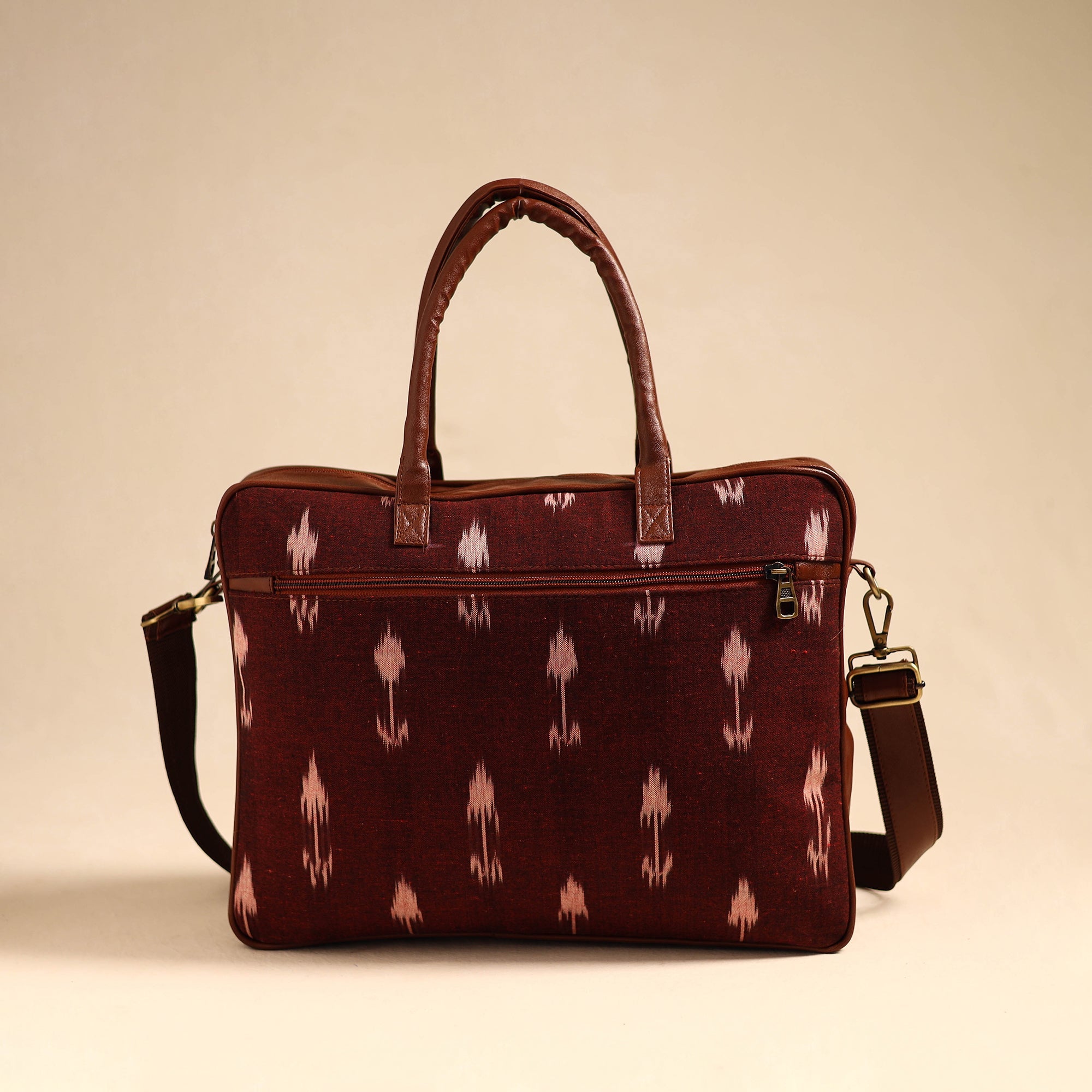 This maroon handmade pochampally ikat cotton laptop bag with an adjustable side strap and detachable sling is designed to protect and carry your laptop with ease and style. Crafted from durable artificial leather and adorned with pochampally Ikat cotton fabric, The interior boasts an eva sheet, ensuring optimal protection. With laptop compartment, two simple and one zipper pocket on the inside, and one zipper pocket outside, there is ample space to keep your laptop and other essentials organised. Embrace a perfect fusion of fashion and utility with this uniquely designed laptop bag.