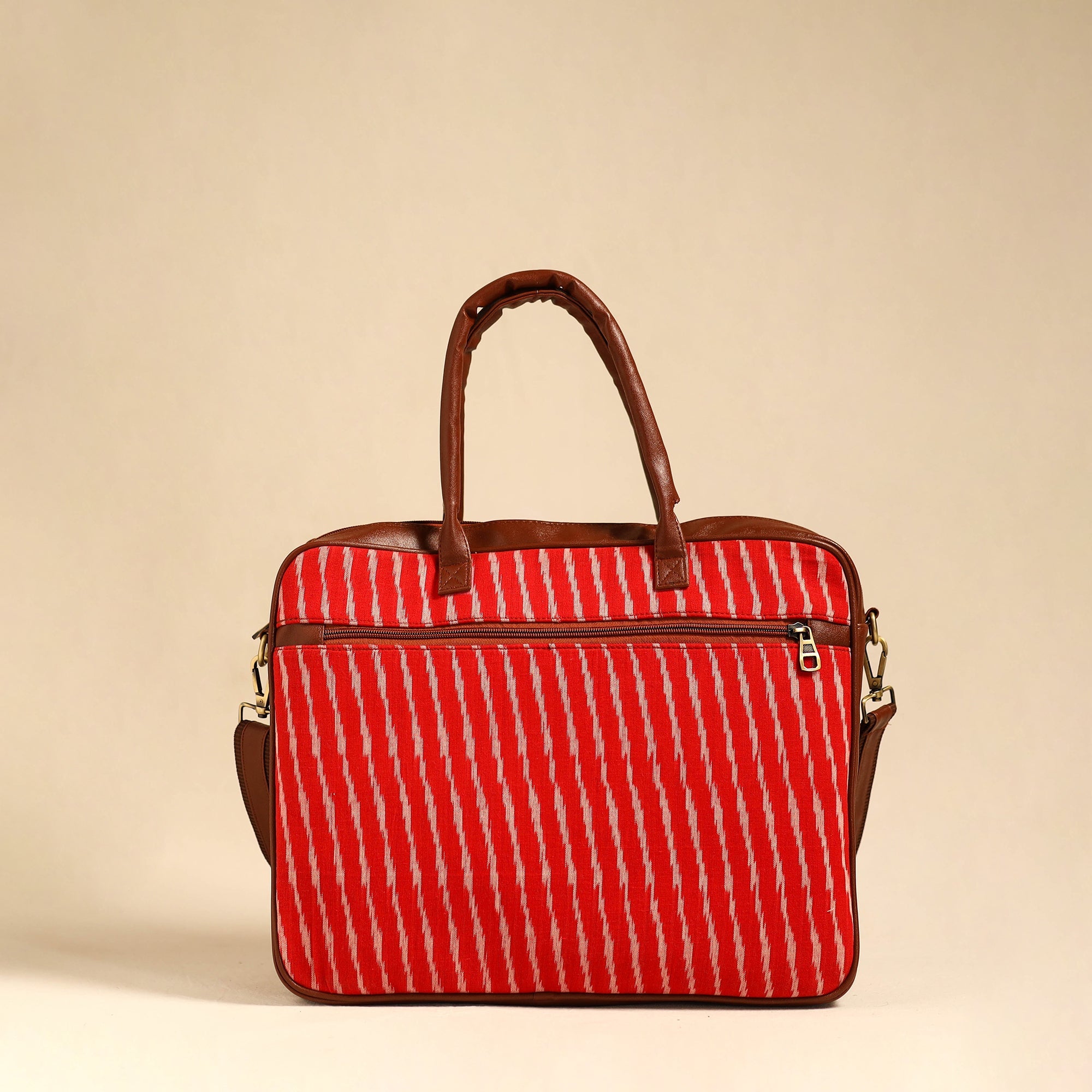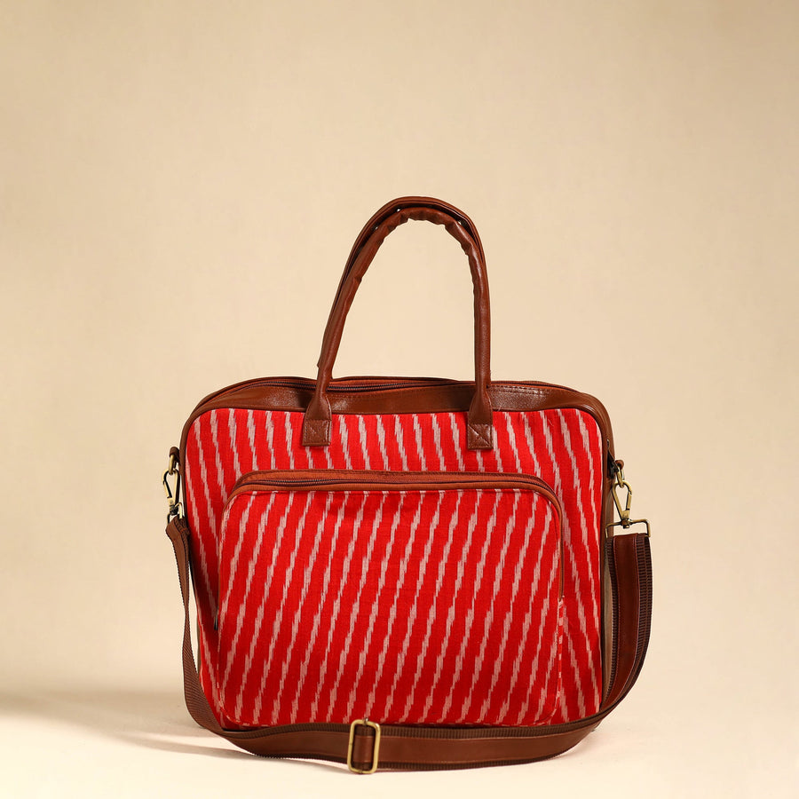 This handmade red pochampally ikat cotton laptop bag with an adjustable side strap and detachable sling is designed to protect and carry your laptop with ease and style. Crafted from durable artificial leather and adorned with pochampally Ikat cotton fabric, The interior boasts an eva sheet , ensuring optimal protection. With laptop compartment, two simple and one zipper pocket on the inside, and one zipper pocket outside, there is ample space to keep your laptop and other essentials organised. Embrace a perfect fusion of fashion and utility with this uniquely designed laptop bag.