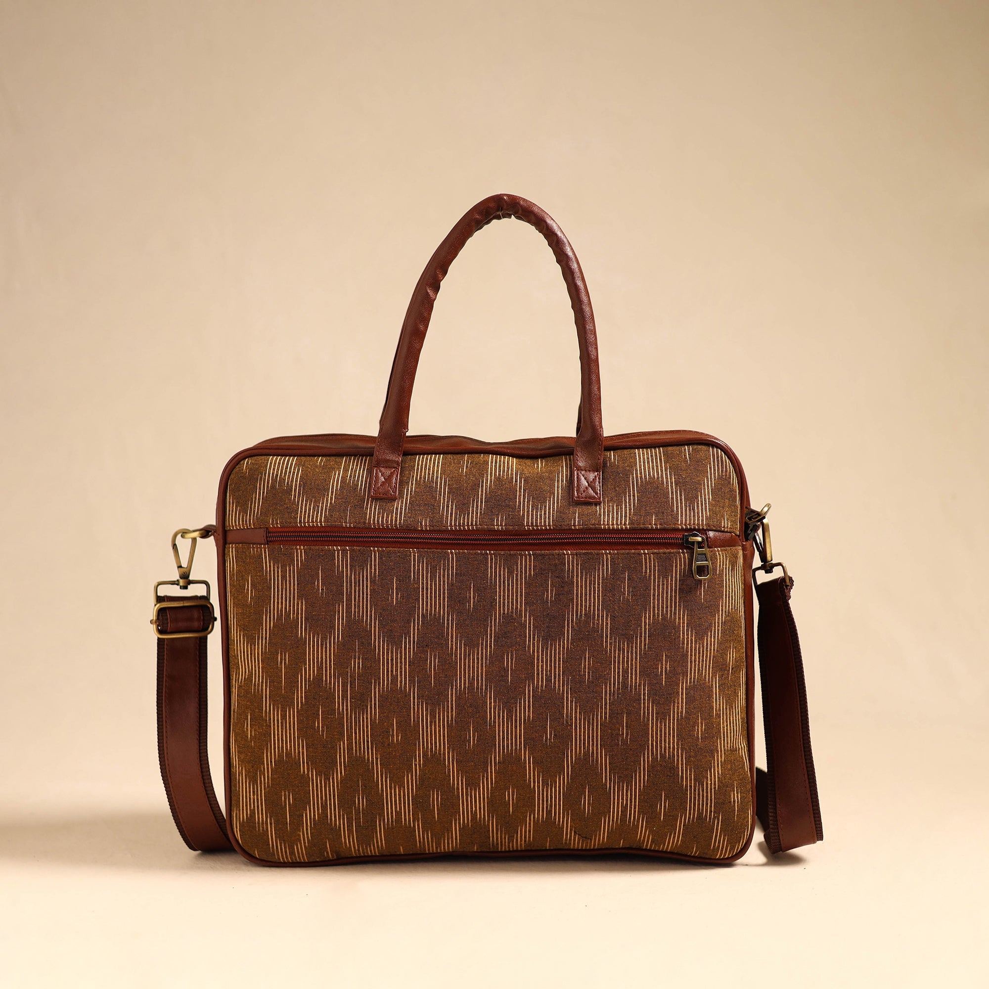 This brown handmade pochampally ikat cotton laptop bag with an adjustable side strap and detachable sling is designed to protect and carry your laptop with ease and style. Crafted from durable artificial leather and adorned with pochampally Ikat cotton fabric, The interior boasts an eva sheet, ensuring optimal protection. With laptop compartment, two simple and one zipper pocket on the inside, and one zipper pocket outside, there is ample space to keep your laptop and other essentials organised. Embrace a perfect fusion of fashion and utility with this uniquely designed laptop bag.