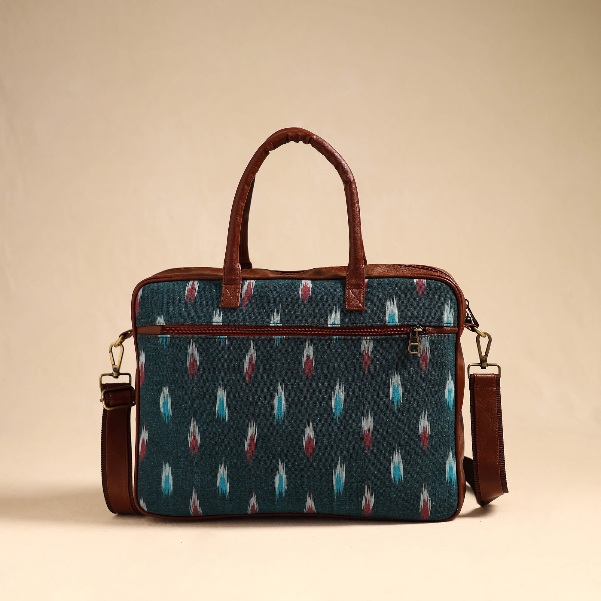 This green handmade pochampally ikat cotton laptop bag with an adjustable side strap and detachable sling is designed to protect and carry your laptop with ease and style. Crafted from durable artificial leather and adorned with pochampally Ikat cotton fabric, The interior boasts an eva sheet, ensuring optimal protection. With laptop compartment, two simple and one zipper pocket on the inside, and one zipper pocket outside, there is ample space to keep your laptop and other essentials organised. Embrace a perfect fusion of fashion and utility with this uniquely designed laptop bag.