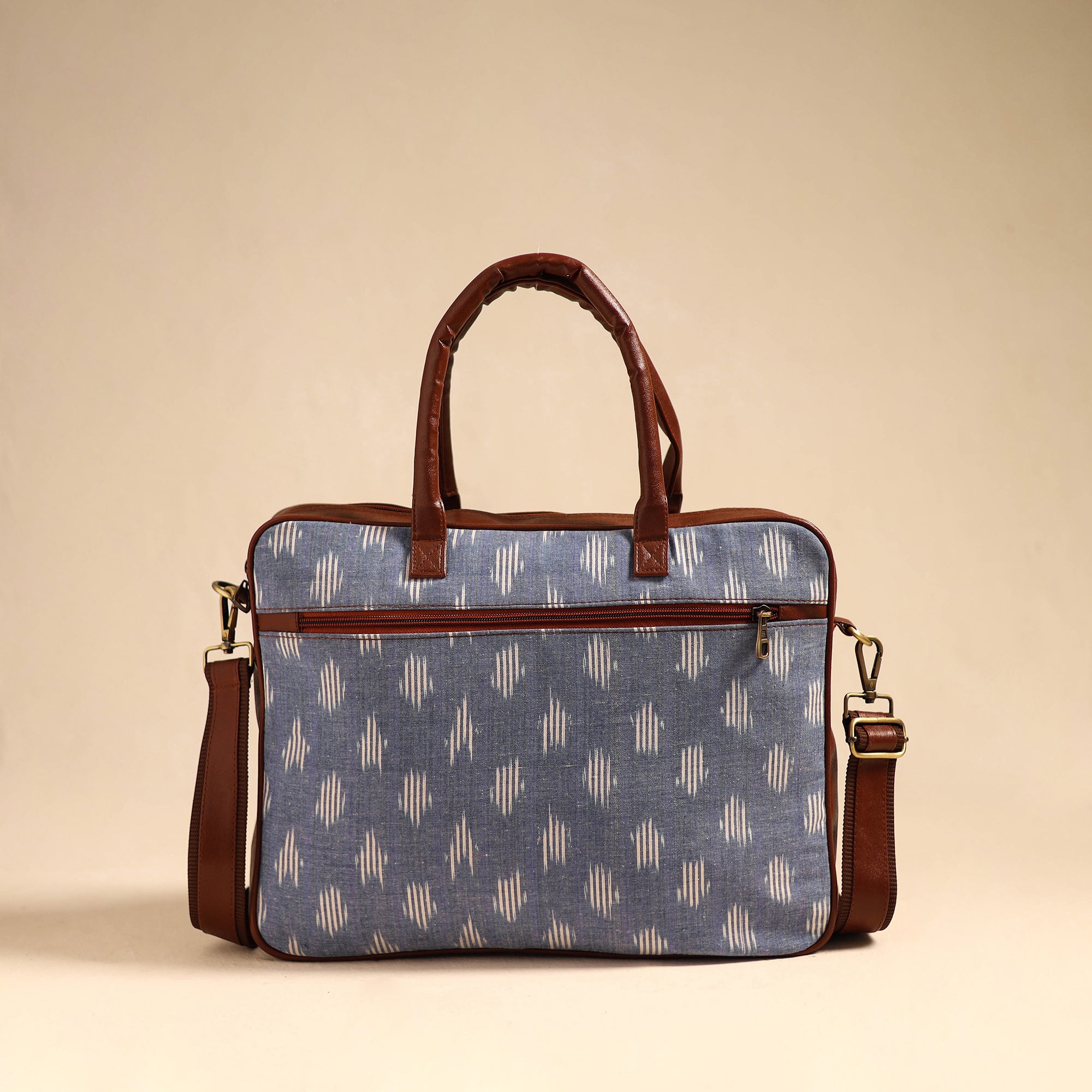 This grey handmade pochampally ikat cotton laptop bag with an adjustable side strap and detachable sling is designed to protect and carry your laptop with ease and style. Crafted from durable artificial leather and adorned with pochampally Ikat cotton fabric, The interior boasts an eva sheet, ensuring optimal protection. With laptop compartment, two simple and one zipper pocket on the inside, and one zipper pocket outside, there is ample space to keep your laptop and other essentials organised. Embrace a perfect fusion of fashion and utility with this uniquely designed laptop bag.