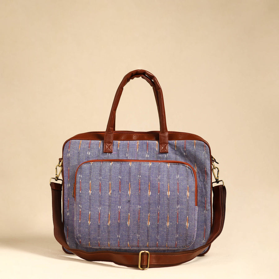 This handmade purple pochampally ikat cotton laptop bag with an adjustable side strap and detachable sling is designed to protect and carry your laptop with ease and style. Crafted from durable artificial leather and adorned with pochampally Ikat cotton fabric, The interior boasts an eva sheet , ensuring optimal protection. With laptop compartment, two simple and one zipper pocket on the inside, and one zipper pocket outside, there is ample space to keep your laptop and other essentials organised. Embrace a perfect fusion of fashion and utility with this uniquely designed laptop bag.
