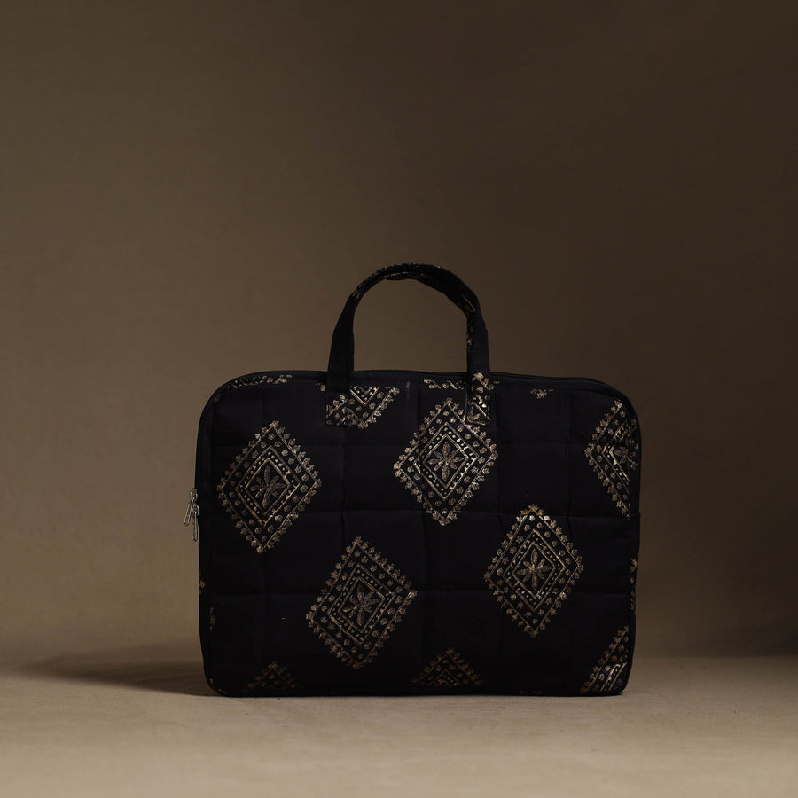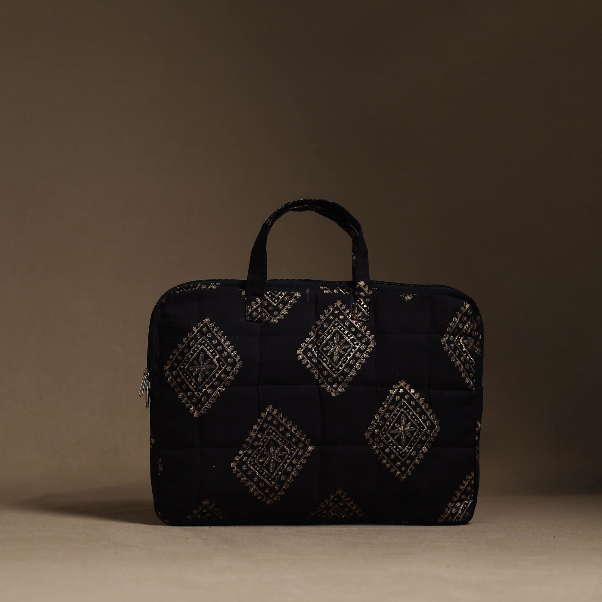 Protect and carry your laptop with style using our exquisite black handmade quilted cotton laptop bag. Crafted from durable cotton fabrics and lined with foam for added protection, this elegant bag features a dedicated laptop compartment and a convenient zipper pocket on the outside.