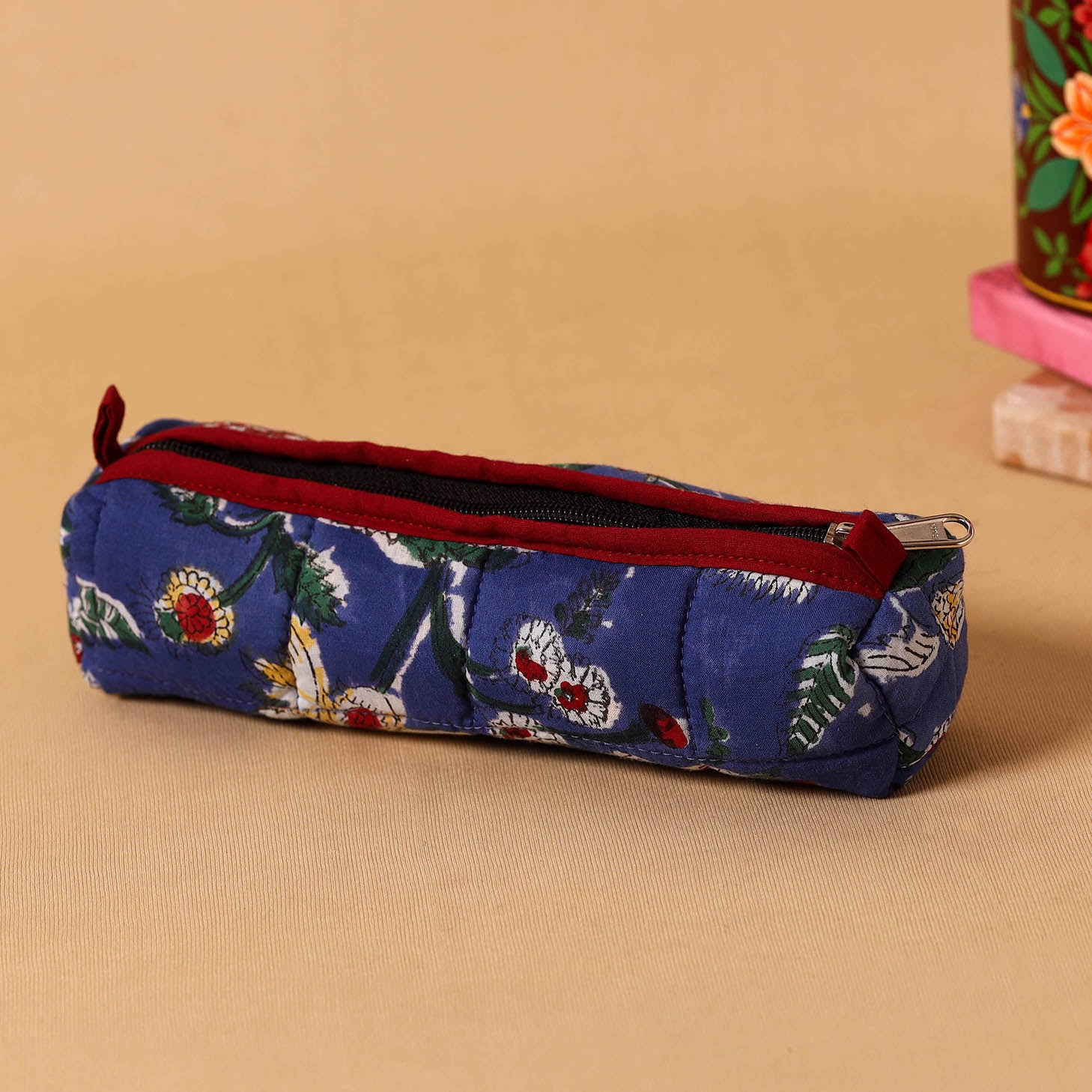 Safely store your pencils, pens, and other essentials in style. This handmade quilted cotton blue pencil pouch blends artistry with functionality. Made from cotton, its soft quilted design ensures durability while keeping your essentials safe.