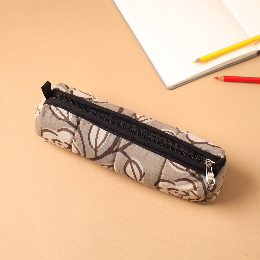 Safely store your pencils, pens, and other essentials in style. This handmade quilted cotton brown pencil pouch blends artistry with functionality. Made from cotton, its soft quilted design ensures durability while keeping your essentials safe.