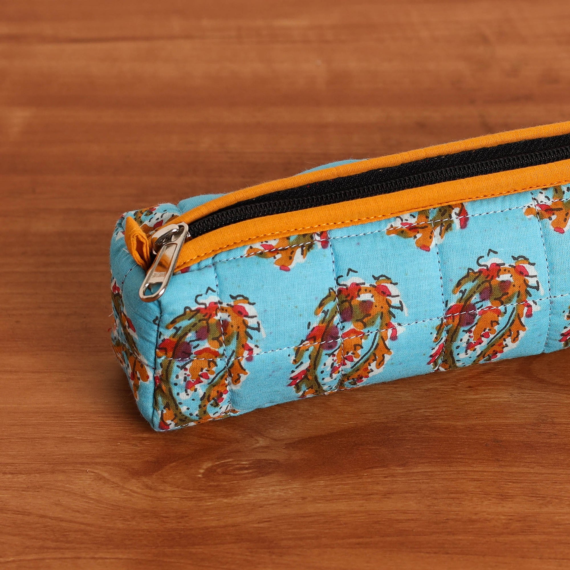 Keep your stationery neatly organized with this blue quilted cotton pencil pouch. Crafted for both style and durability, its cushioned design offers excellent protection for your essentials. Perfectly versatile, it easily accommodates pens, pencils, and small accessories.