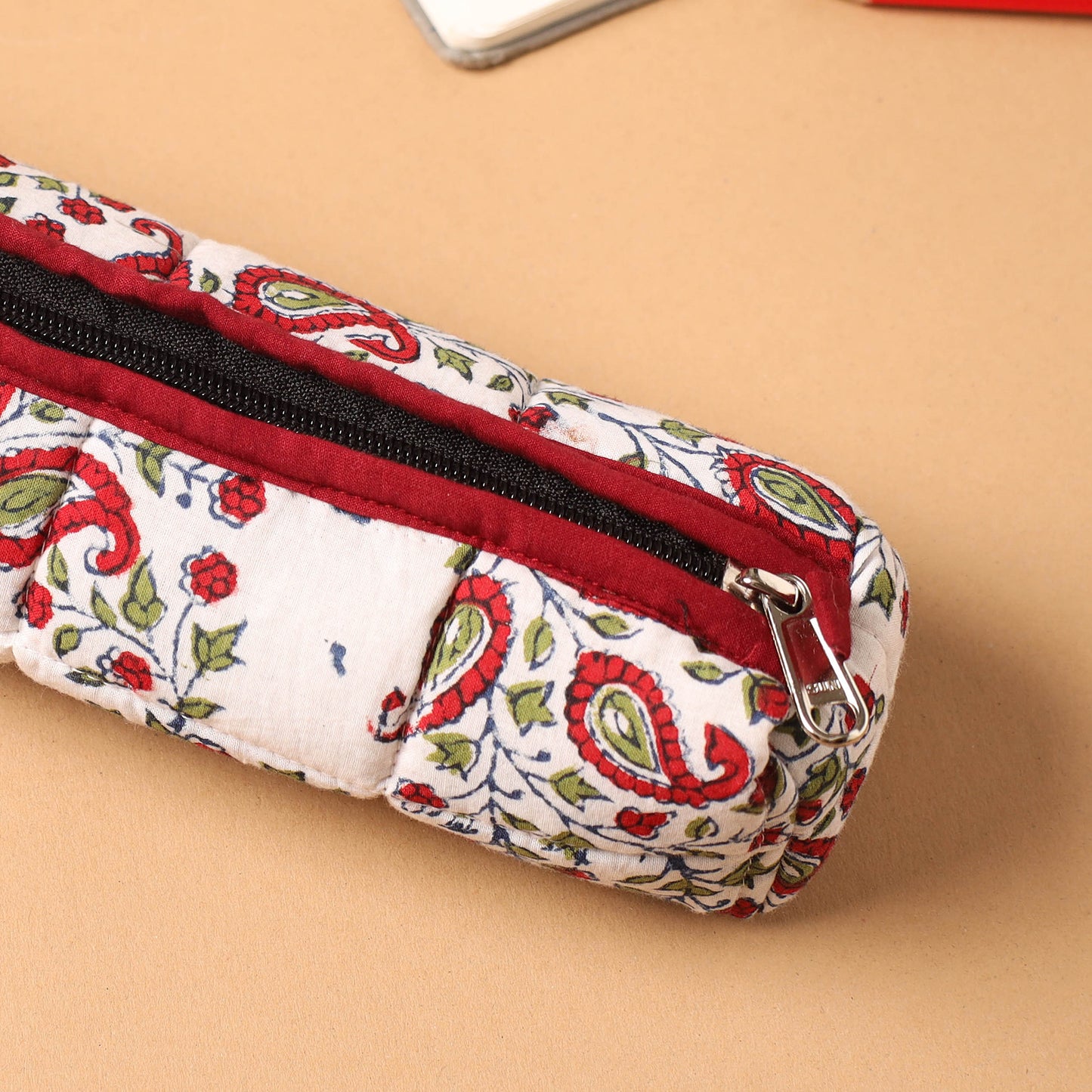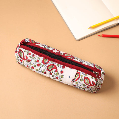 Safely store your pencils, pens, and other essentials in style. This handmade white quilted cotton white pencil pouch blends artistry with functionality. Made from cotton, its soft quilted design ensures durability while keeping your essentials safe.