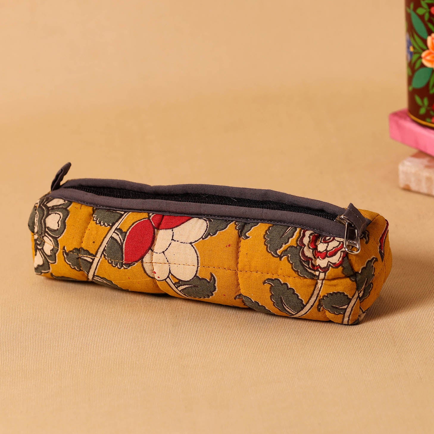Safely store your pencils, pens, and other essentials in style. This handmade yellow quilted cotton pencil pouch blends artistry with functionality. Made from cotton, its soft quilted design ensures durability while keeping your essentials safe.