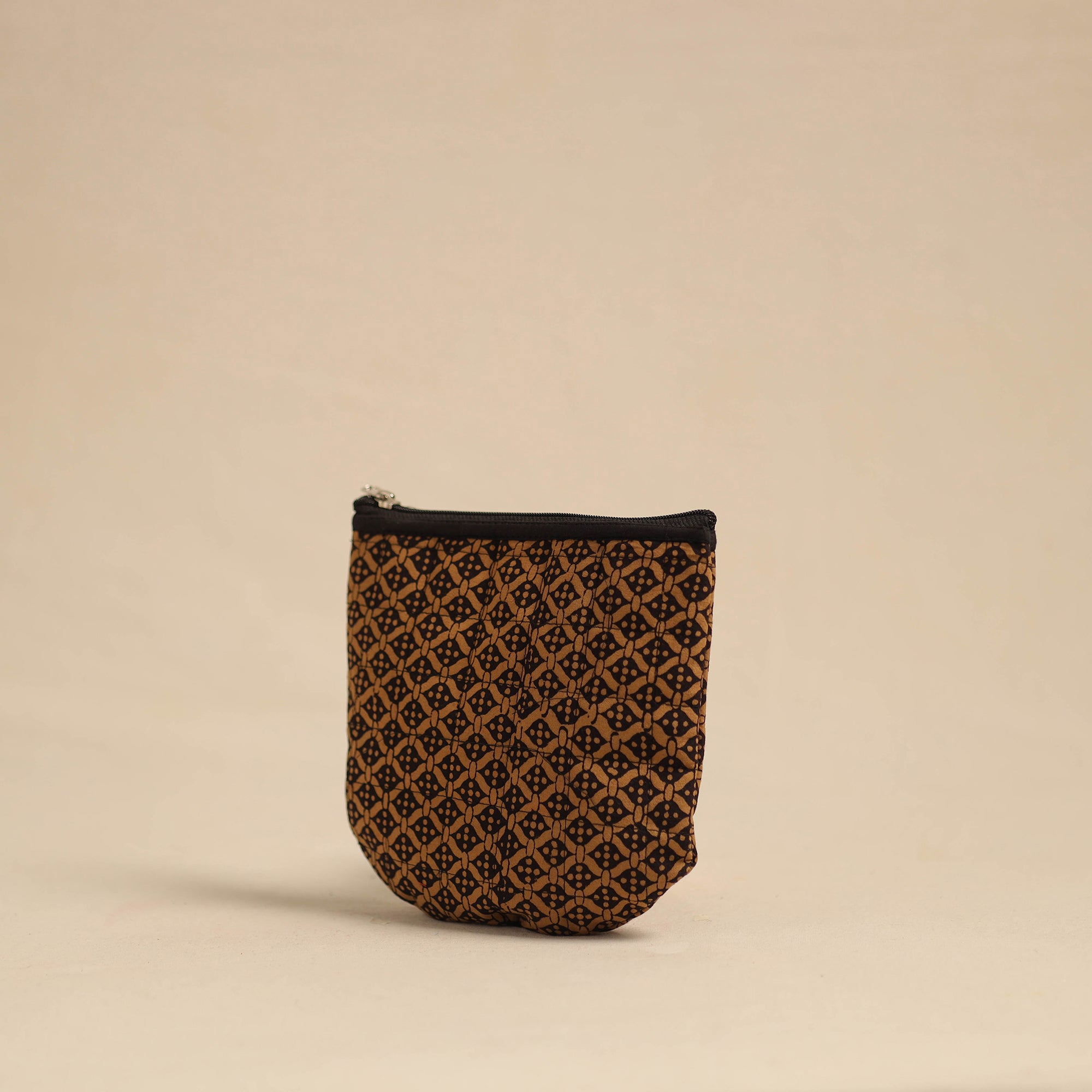 This brown handmade quilted cotton utility pouch. This quilted design not only adds charm but also enhances durability, making it perfect for daily use. This utility pouch with a zip-lock main closure, providing ample space for your essentials. The foam layer lining ensures durability and protection.