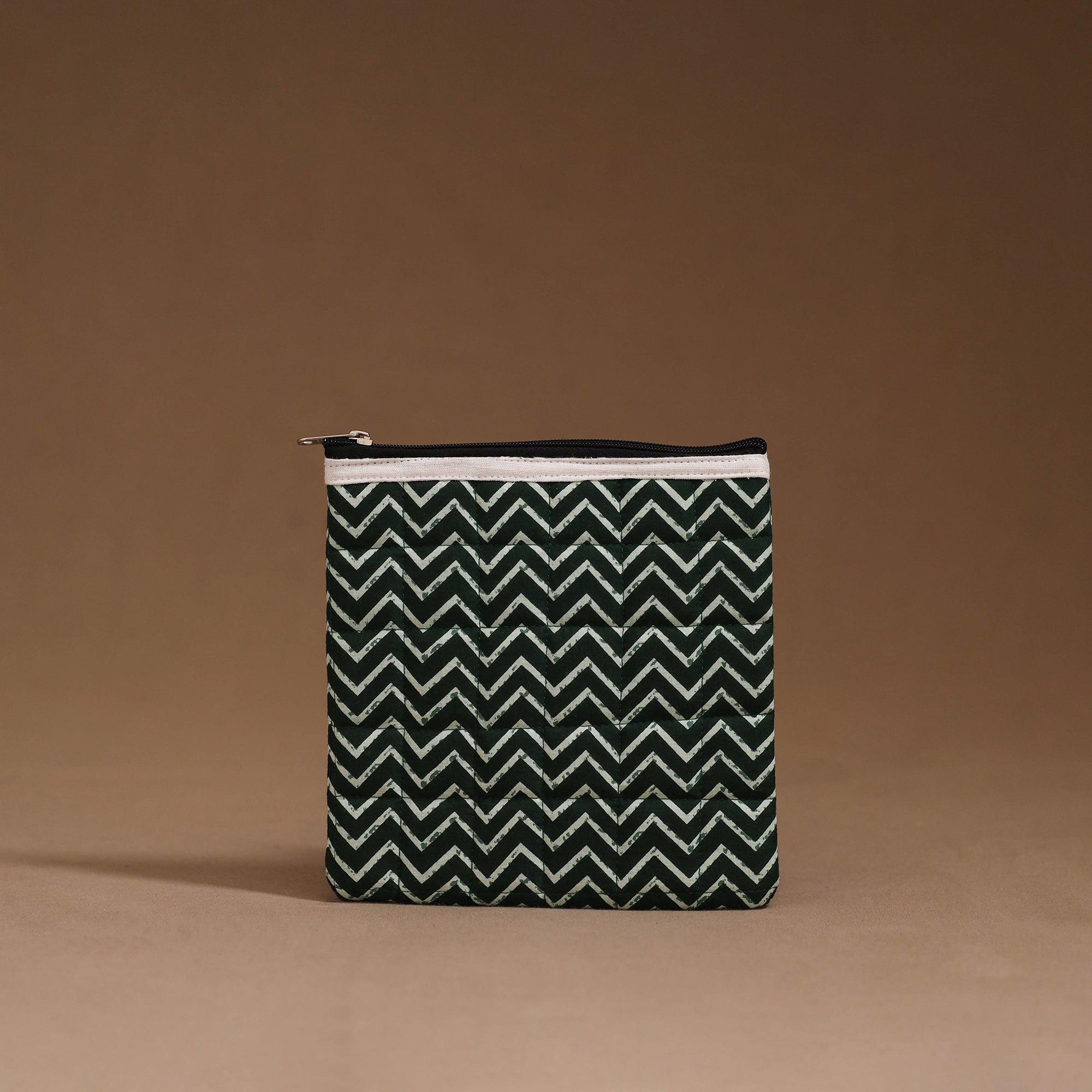 Green quilted utility pouch is made using indian handmade cotton textiles. It features a zip-lock main closure with ample space for essentials, while the foam lining adds durability and protection, making it perfect for travel and everyday organization needs.