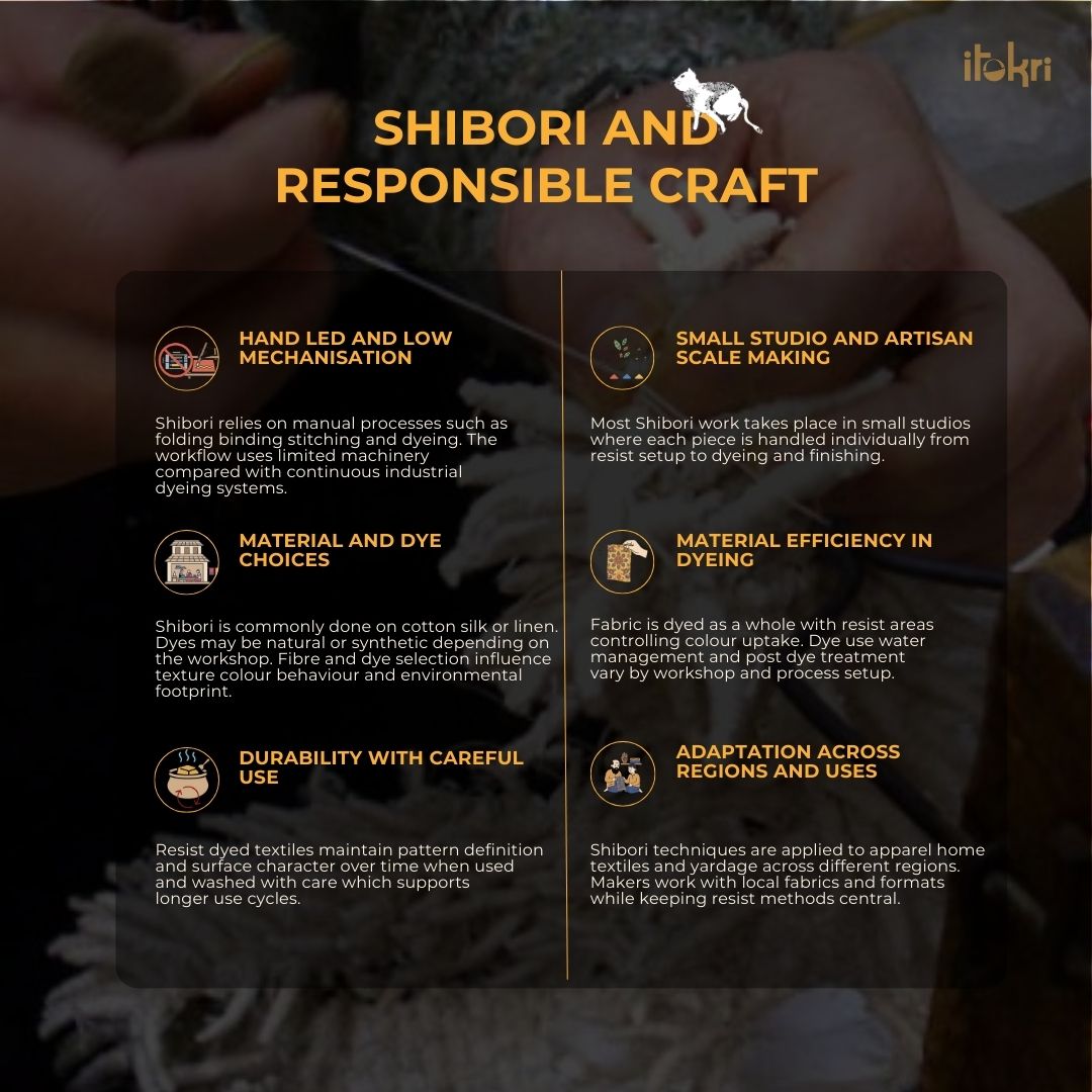 Shibori is a very well-known dyeing craft technique that involves folding, twisting, or bunching cloth and binding it, and after that dyeing it in indigo and other colors. It is practiced in Delhi, Gujarat, and Rajasthan.