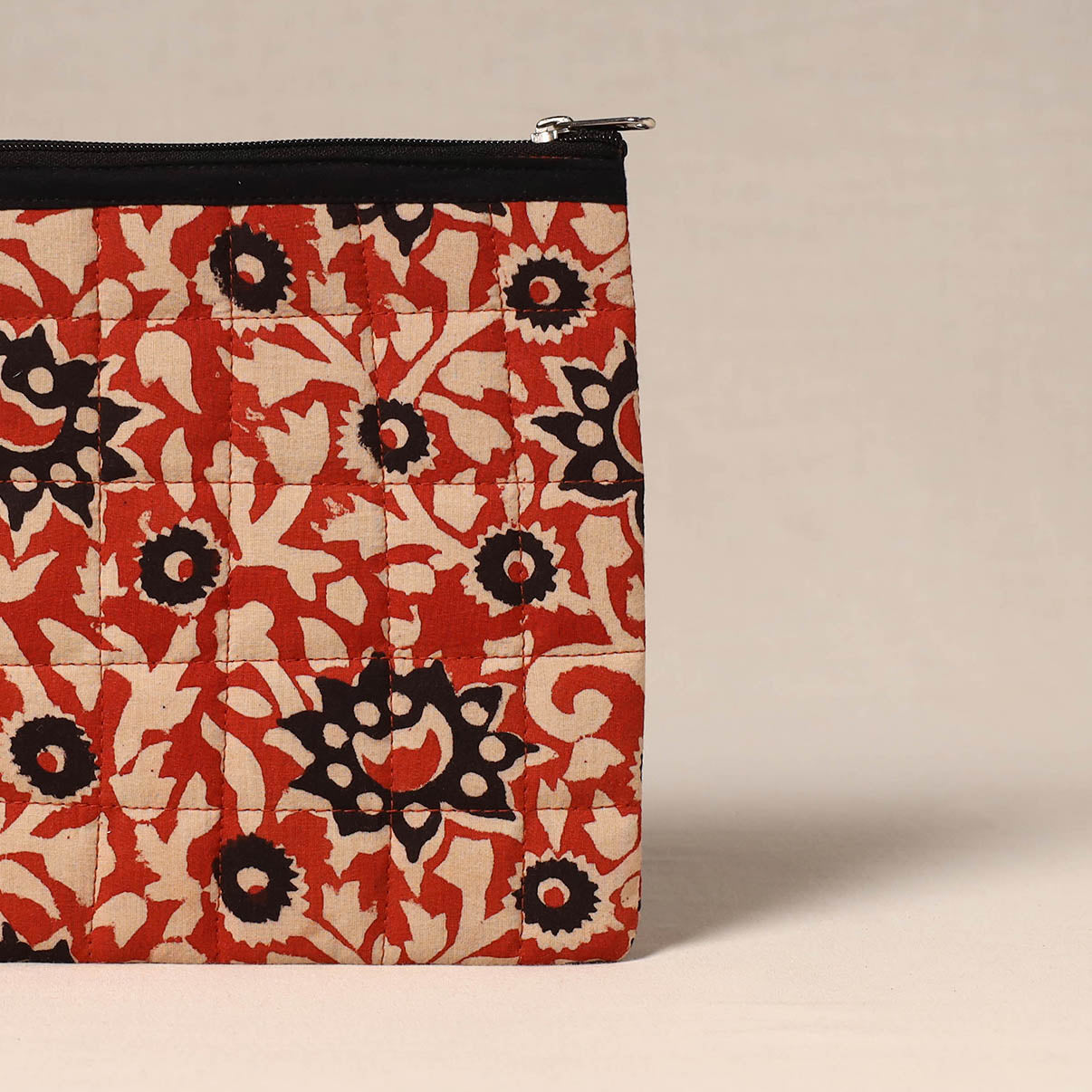Utility pouch is made from handmade textiles and finished with a quilted surface for added strength. It includes a zippered main compartment and foam lining to help protect essentials while travelling or storing daily items.