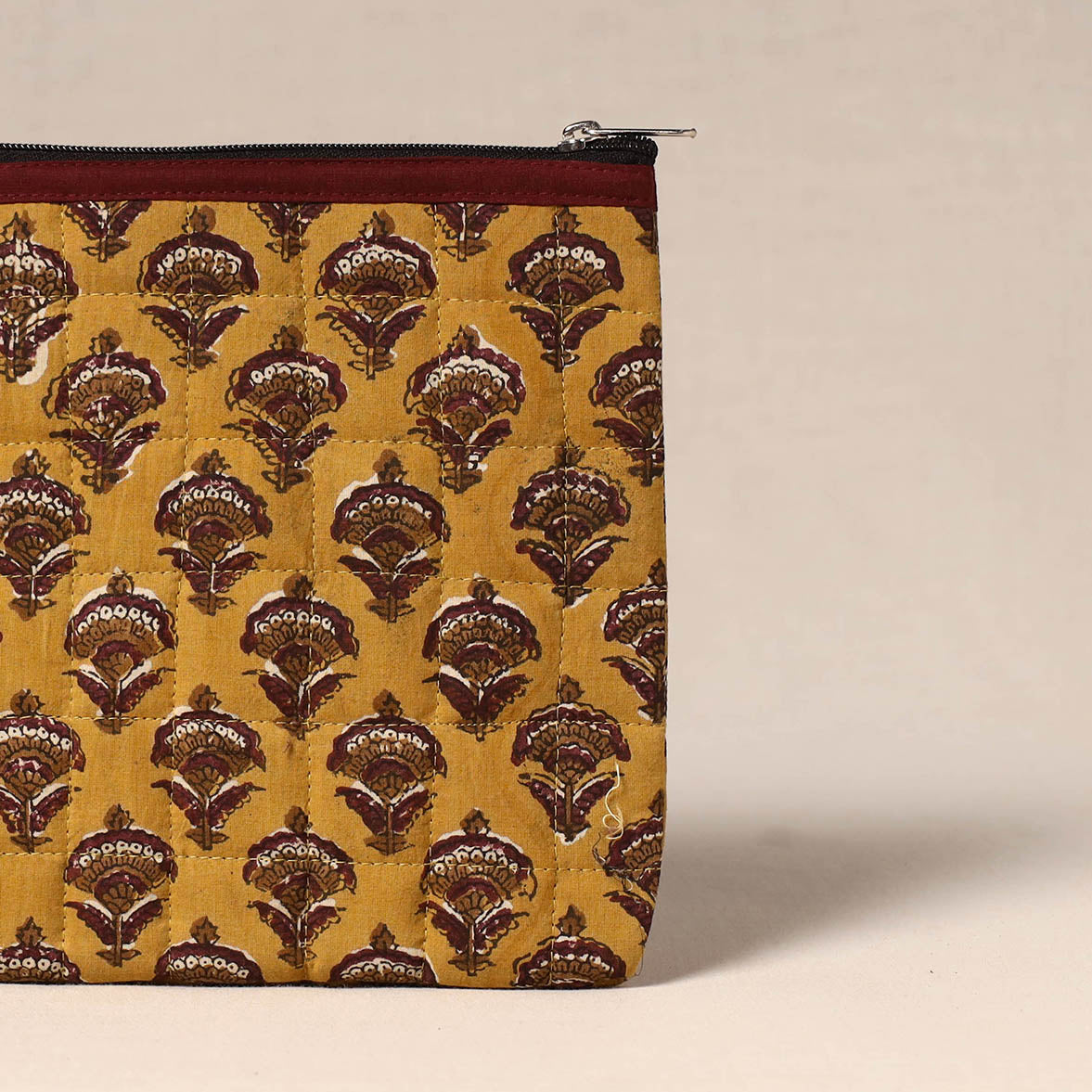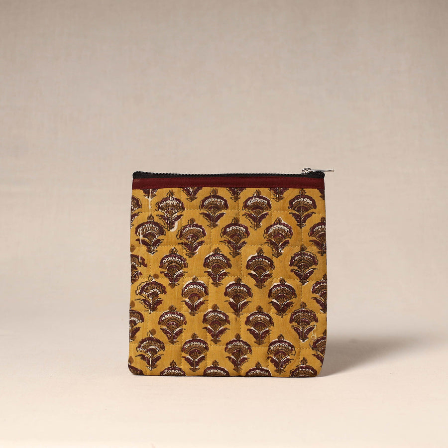 Utility pouch is made from handmade textiles and finished with a quilted surface for added strength. It includes a zippered main compartment and foam lining to help protect essentials while travelling or storing daily items.