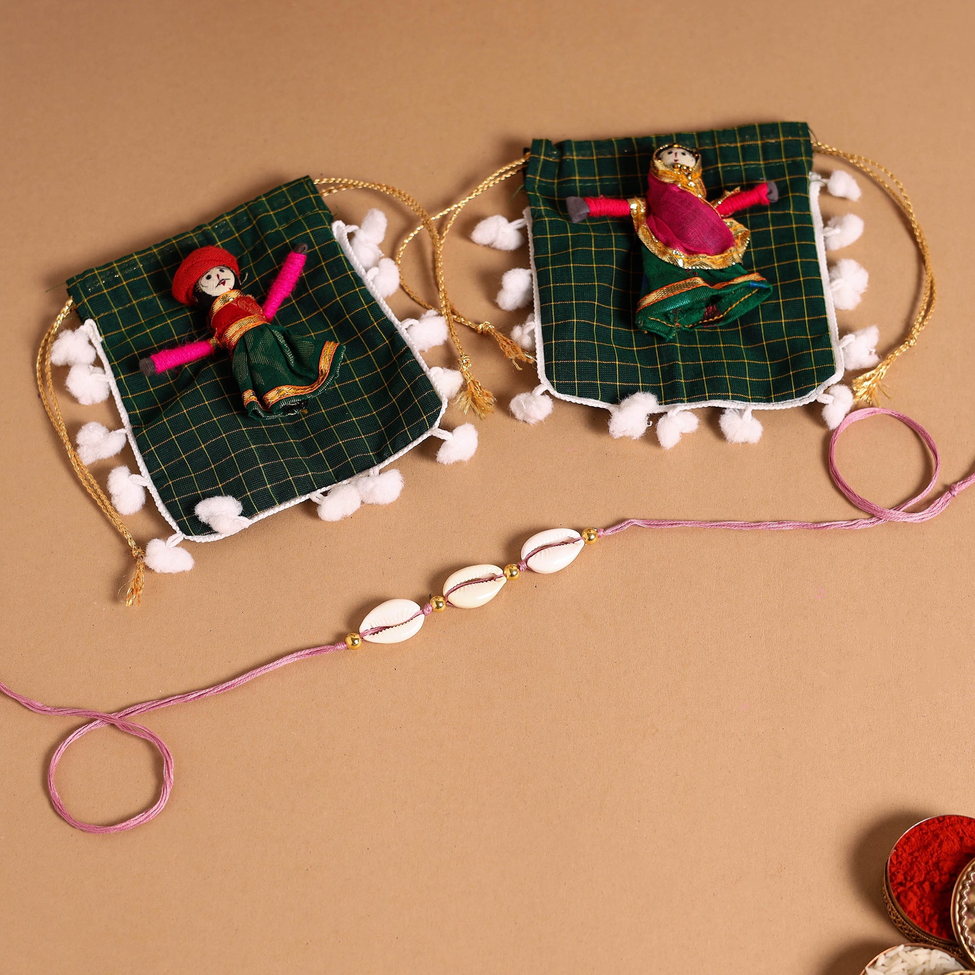 Celebrate the bond of love and tradition with this handmade shell and bead work rakhi and lumba set. Crafted with vibrant colors and intricate patterns, this set beautifully symbolizes care, affection, and festive spirit. Perfect for Raksha Bandhan, it’s a meaningful way to express love. Includes a potli for gifting.