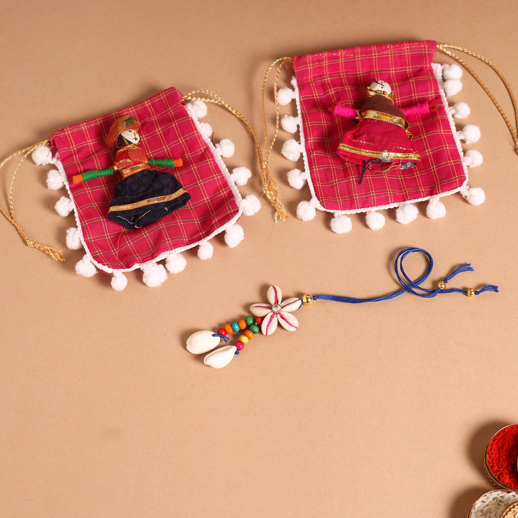 Celebrate the bond of love and tradition with this handmade shell and bead work rakhi and lumba set. Crafted with vibrant colors and intricate patterns, this set beautifully symbolizes care, affection, and festive spirit. Perfect for Raksha Bandhan, it’s a meaningful way to express love. Includes a potli for gifting.