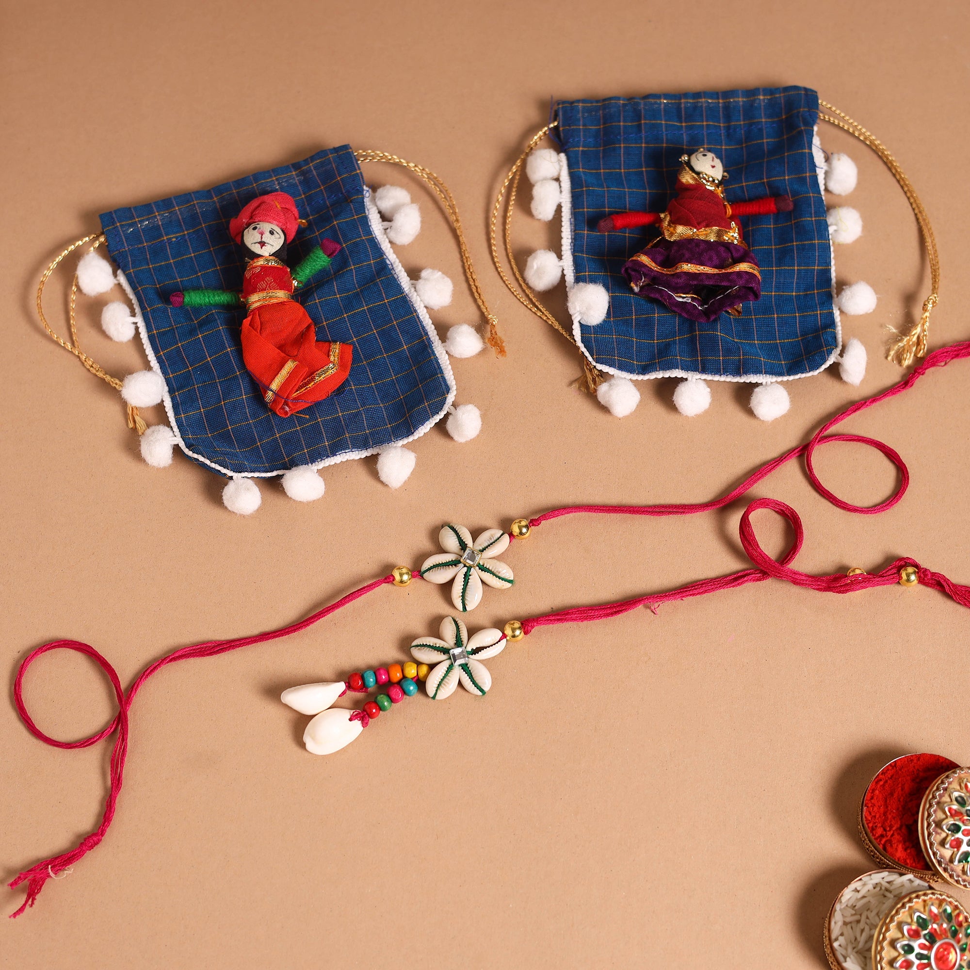 Celebrate the bond of love and tradition with this handmade shell and bead work rakhi and lumba set. Crafted with vibrant colors and intricate patterns, this set beautifully symbolizes care, affection, and festive spirit. Perfect for Raksha Bandhan, it’s a meaningful way to express love. Includes a potli for gifting.