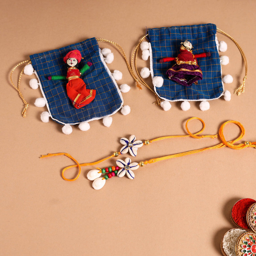Celebrate the bond of love and tradition with this handmade shell and bead work rakhi and lumba set. Crafted with vibrant colors and intricate patterns, this set beautifully symbolizes care, affection, and festive spirit. Perfect for Raksha Bandhan, it’s a meaningful way to express love. Includes a potli for gifting.