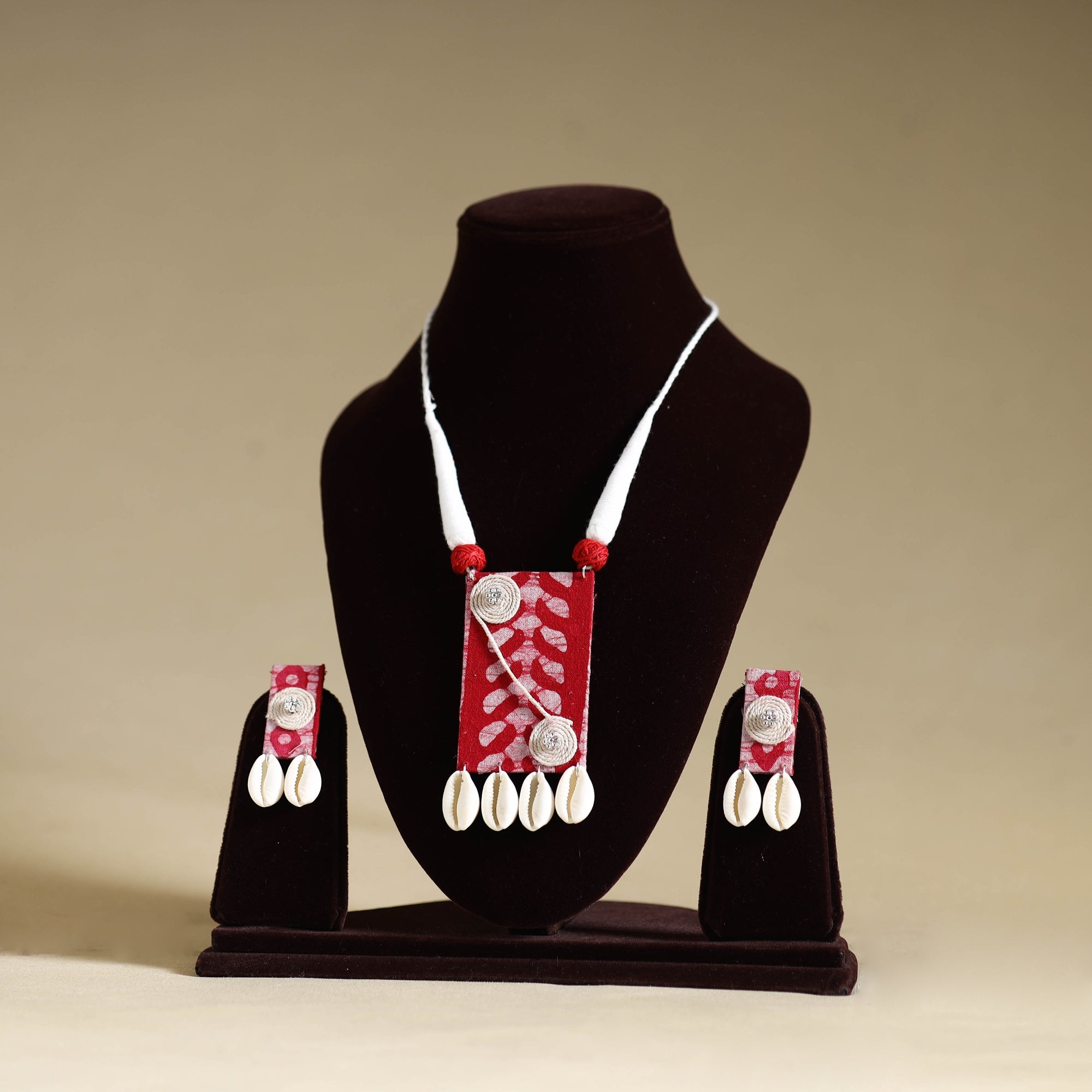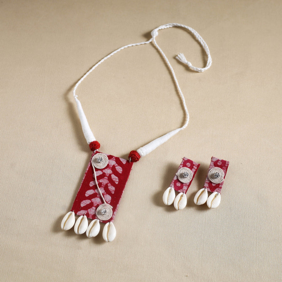 Add a touch of elegance to your ensemble with this pink handmade fabart shell work necklace set. Designed by skilled artisans, this necklace and earring set seamlessly blends traditional craftsmanship with a modern aesthetic. Made with thread, the necklace features a fabric pendant adorned with shells and german silver elements, making it a unique and stylish accessory for any outfit.