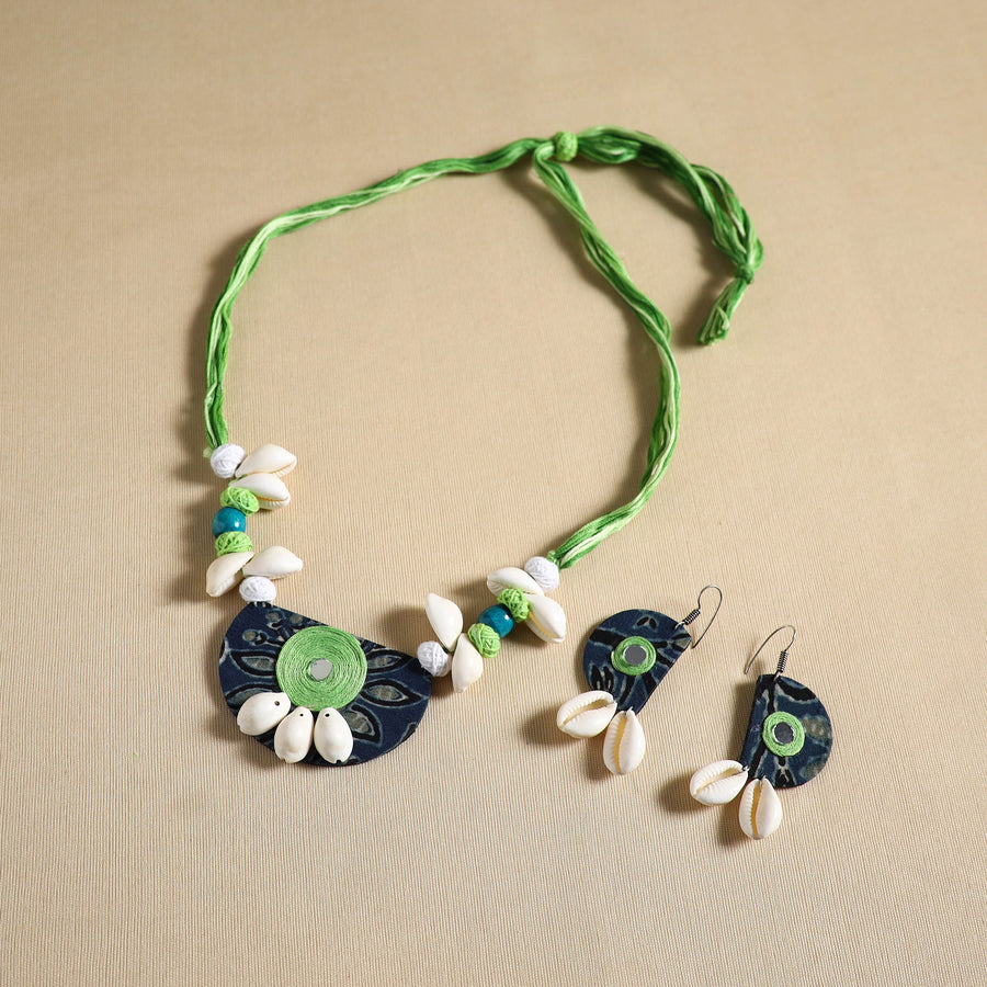 Elevate your style with our exquisite shell work green fabart necklace set for women. Crafted by skilled artisans, this stunning set seamlessly blends traditional artistry with a modern touch. Made with fine thread, the necklace features a fabric pendant beautifully adorned with mirror work, shell and wooden beads, creating a unique and elegant charm. Perfect for enhancing any outfit with a touch of handcrafted beauty.