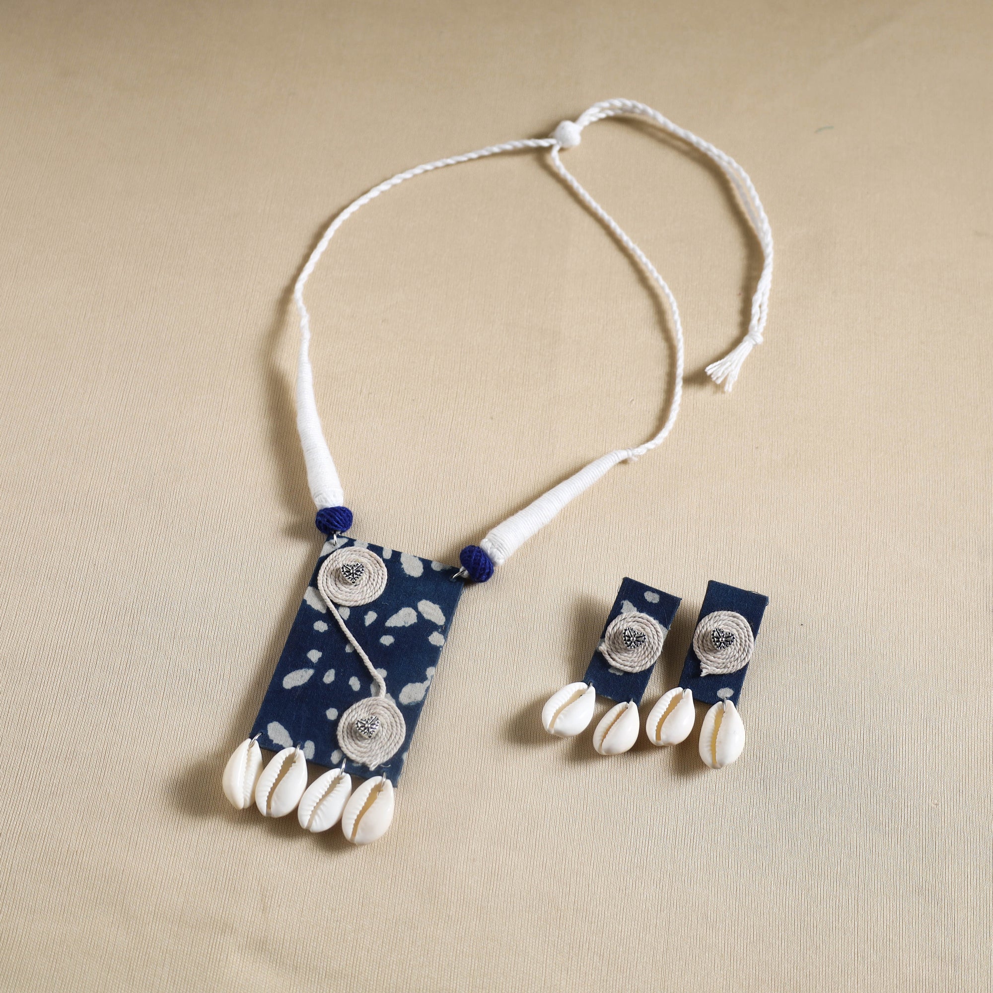 Add a touch of elegance to your ensemble with this blue handmade fabart shell work necklace set. Designed by skilled artisans, this necklace and earring set seamlessly blends traditional craftsmanship with a modern aesthetic. Made with thread, the necklace features a fabric pendant adorned with shells and german silver elements, making it a unique and stylish accessory for any outfit.
