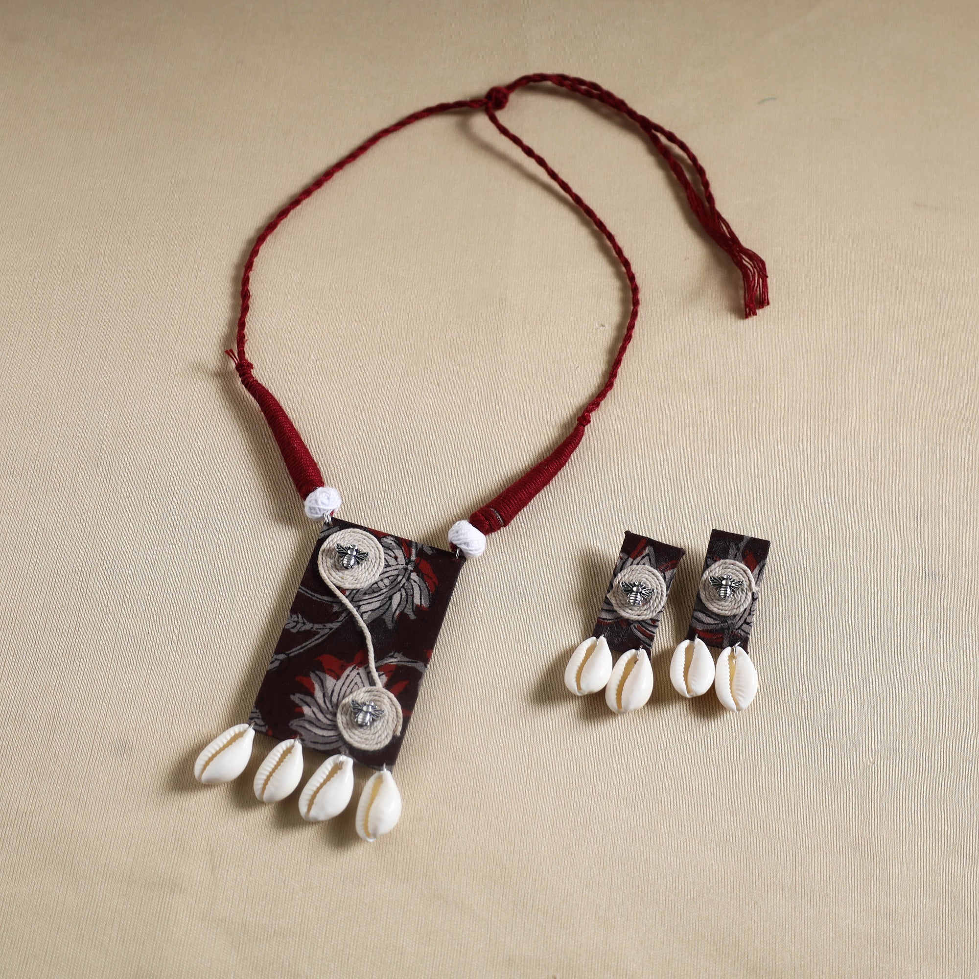 Add a touch of elegance to your ensemble with this maroon handmade fabart shell work necklace set. Designed by skilled artisans, this necklace and earring set seamlessly blends traditional craftsmanship with a modern aesthetic. Made with thread, the necklace features a fabric pendant adorned with shells and german silver elements, making it a unique and stylish accessory for any outfit.