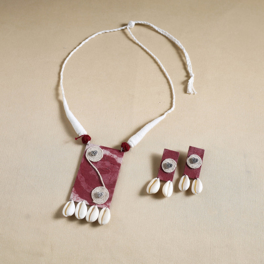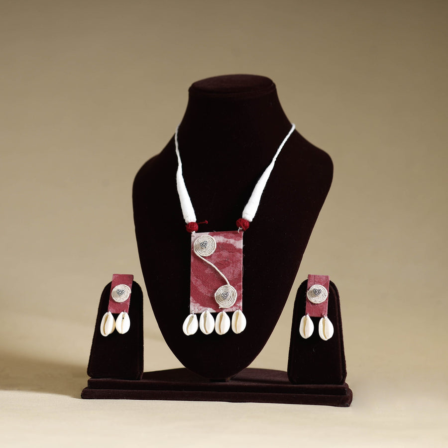 Add a touch of elegance to your ensemble with this maroon handmade fabart shell work necklace set. Designed by skilled artisans, this necklace and earring set seamlessly blends traditional craftsmanship with a modern aesthetic. Made with thread, the necklace features a fabric pendant adorned with shells and german silver elements, making it a unique and stylish accessory for any outfit.