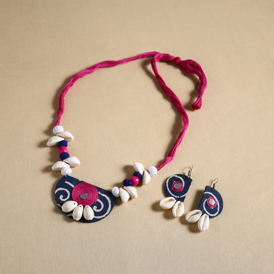 Elevate your style with our exquisite shell work pink fabart necklace set for women. Crafted by skilled artisans, this stunning set seamlessly blends traditional artistry with a modern touch. Made with fine thread, the necklace features a fabric pendant beautifully adorned with mirror work, shell and wooden beads, creating a unique and elegant charm. Perfect for enhancing any outfit with a touch of handcrafted beauty.