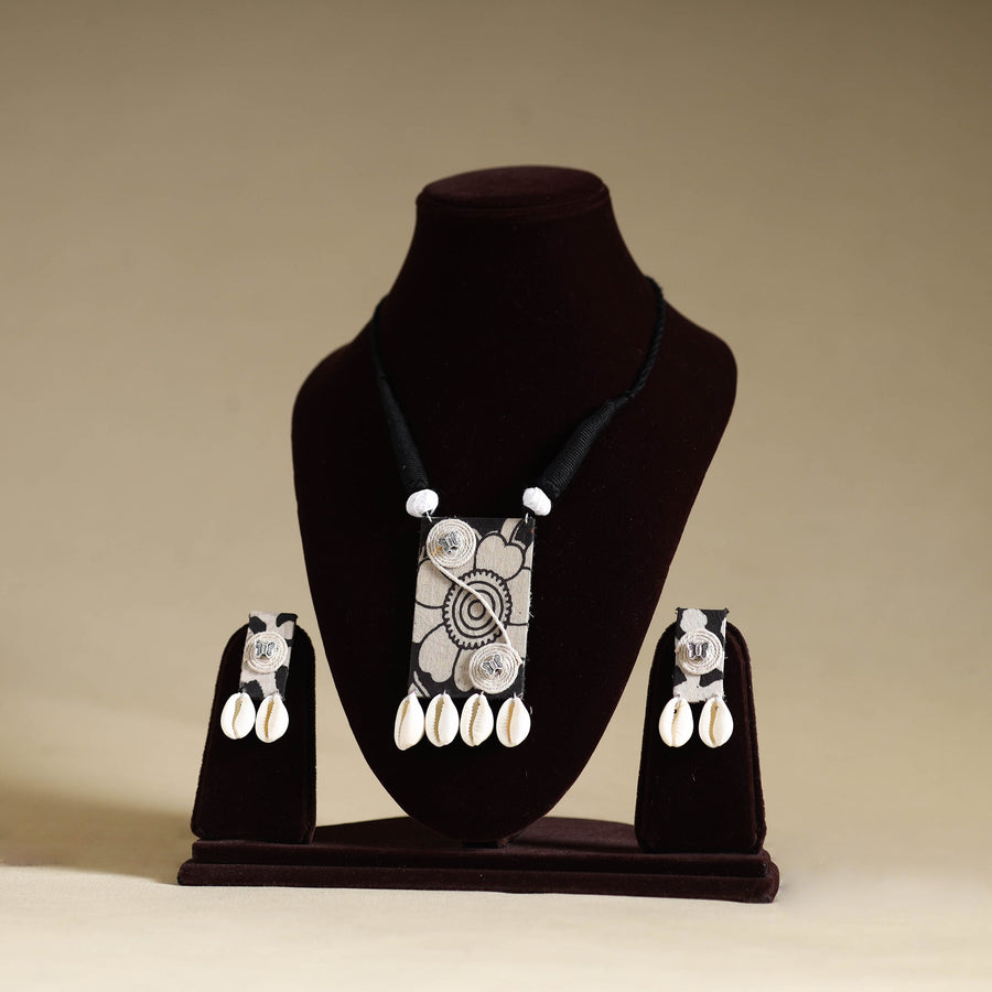 Add a touch of elegance to your ensemble with this black handmade fabart shell work necklace set. Designed by skilled artisans, this necklace and earring set seamlessly blends traditional craftsmanship with a modern aesthetic. Made with thread, the necklace features a fabric pendant adorned with shells and german silver elements, making it a unique and stylish accessory for any outfit.