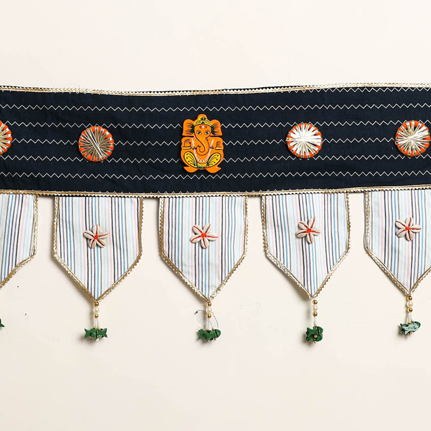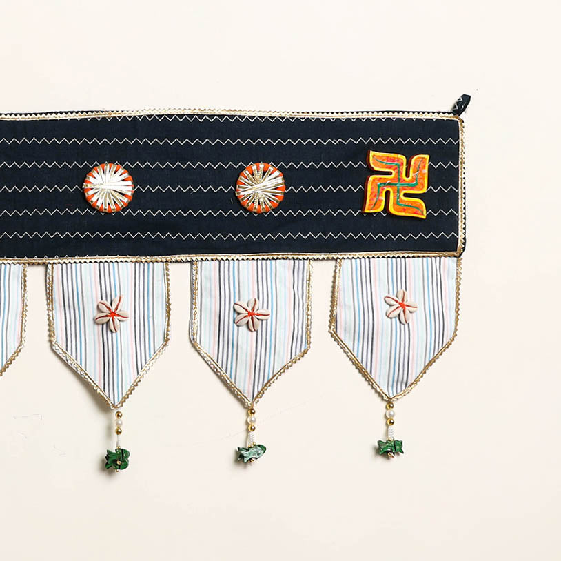 Celebrate tradition with this handcrafted toran, made from fabric and adorned with shells and gota patti. This piece is uniquely crafted by skilled artisans, making every toran a one-of-a-kind festive accent. Designed for doors and entryways, it brings a joyful and welcoming vibe to your home. Whether for everyday décor or special occasions, this toran beautifully blends vibrant charm with Indian artistry.