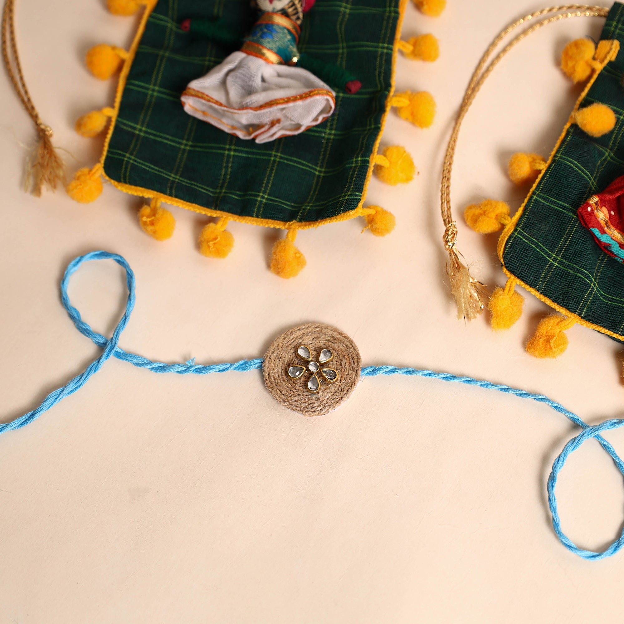 Celebrate the joyous festival of raksha bandhan with our exquisite handmade jute rakhi. Skillfully handcrafted with intricate stonework, this rakhi is a true symbol of love and affection between brother and sister. It comes with a charming potli for an added touch of elegance.