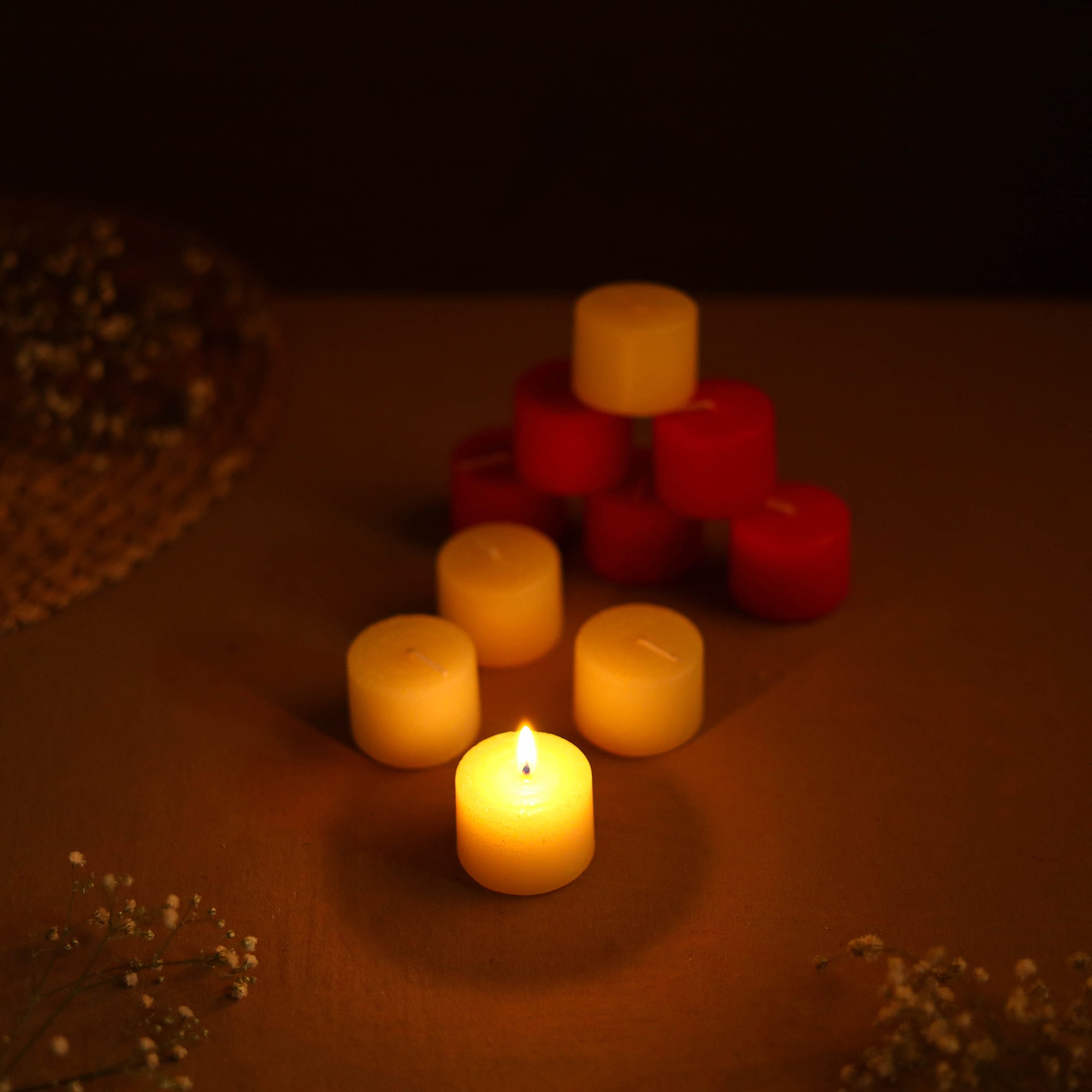 Illuminate your space with our aromatic pillar candles (Set of 10). Perfect to uplift the mood of any room or space. Each candle burns for a long time, offering a sustainable lighting option.