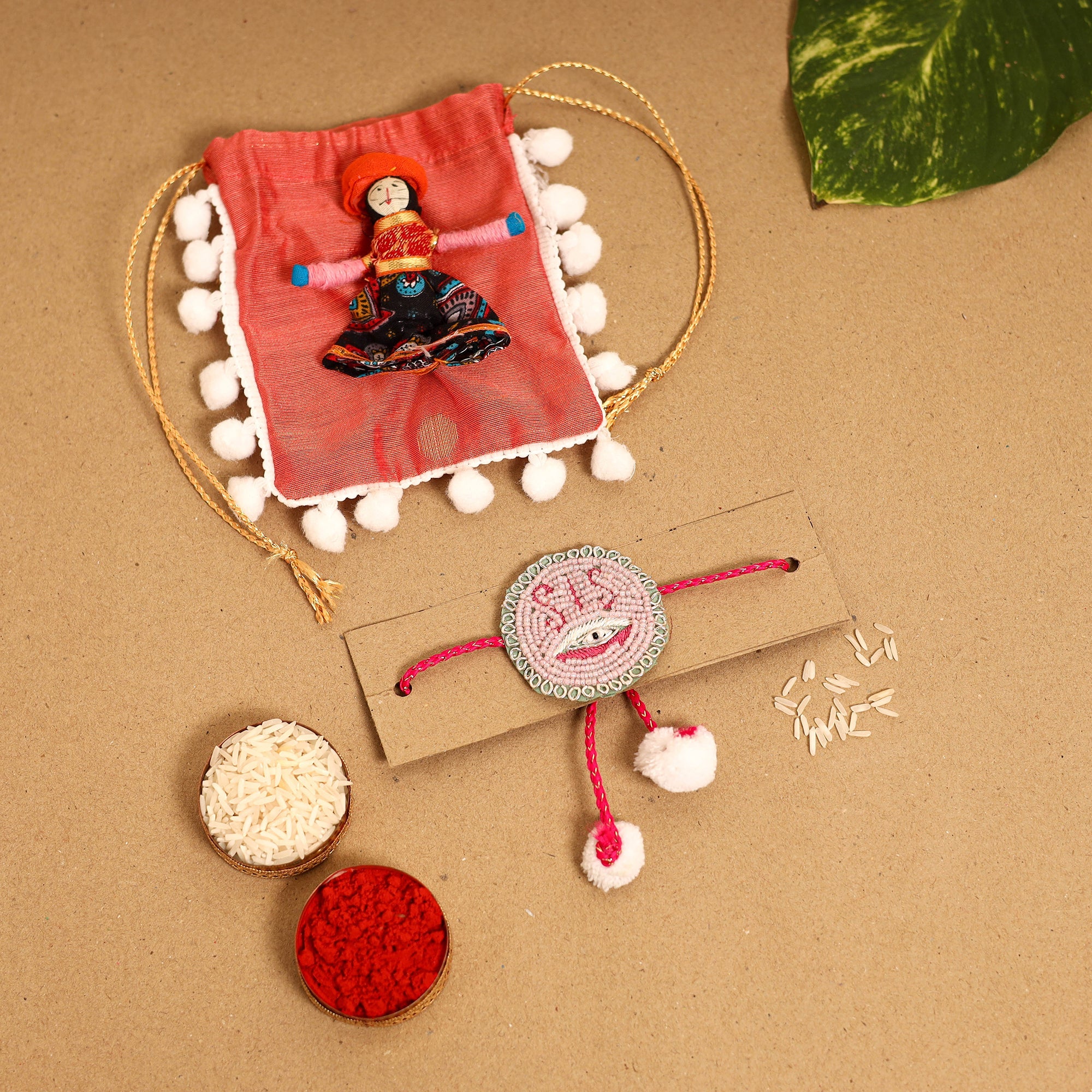 Colourful sequin and glass bead & threadwork rakhi handcrafted for the very special khatta meetha bond between sister and sister-in-laws. This Rakhi will come with a potli for added charm. The beads in this lumba rakhi are threaded with wire.