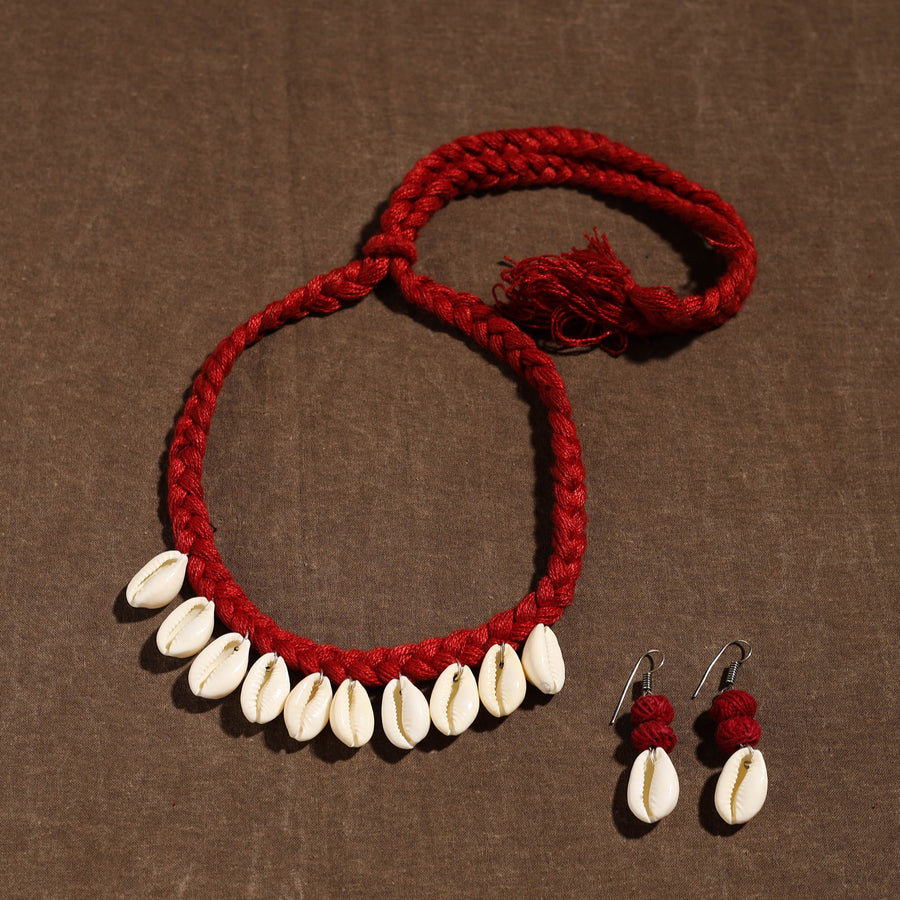 Embrace the elegance of artisanal design with this red handmade thread-braided shell necklace set. Created by skilled artisans, this necklace and earring set seamlessly blends tradition with contemporary elegance. Made with intricately braided thread and adorned with delicate shells, it adds a unique and artistic charm to any ensemble, making it a perfect addition to your wardrobe.