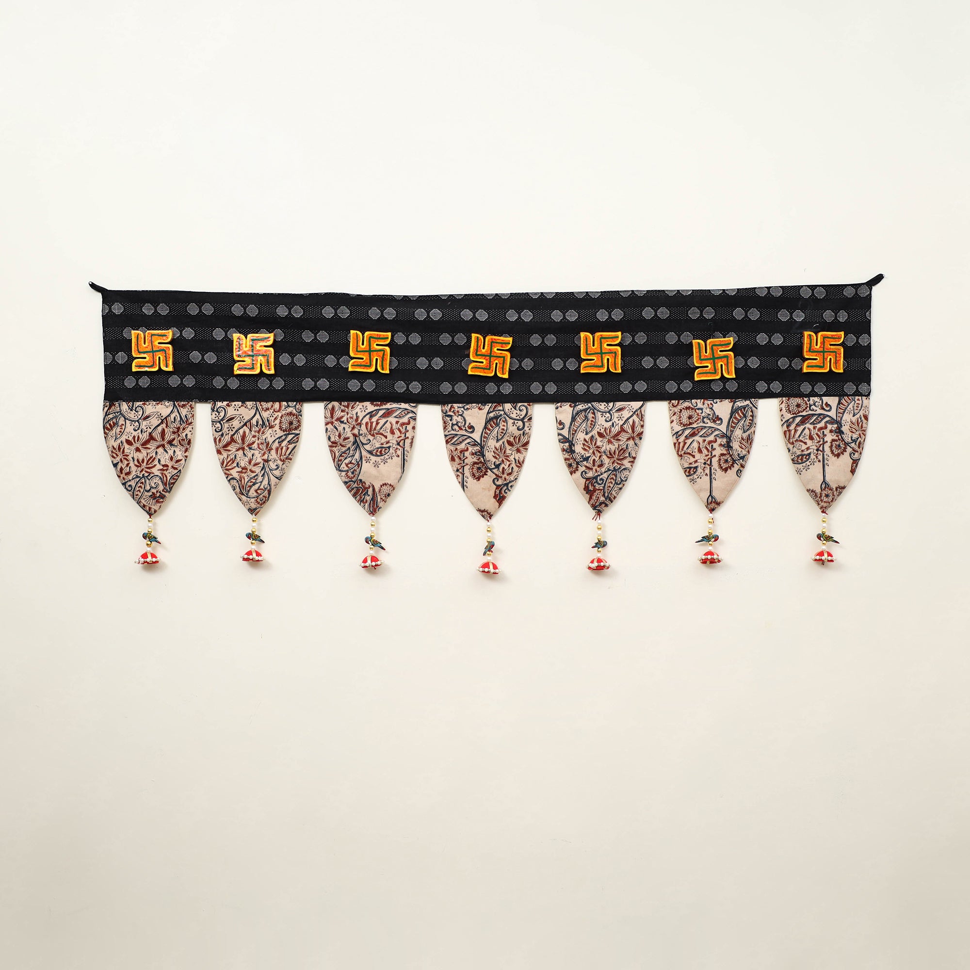 Welcome your guests with a touch of tradition! This handmade toran for door decoration. Adorned with intricate gota patti, pom pom, and shell work. Torans have been used in Indian decor for centuries, symbolizing auspiciousness. This toran is crafted with care, adding charm and elegance to any space.