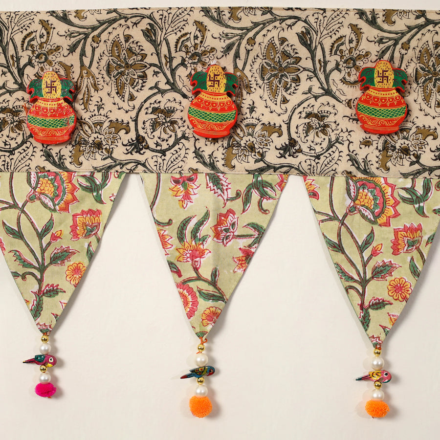 The origins of toran can be traced back to Purana (a work of Hindu mythology). Torans are used to decorate the main entrance to a dwelling. The main idea behind decorating the house is to please and attract the goddess of wealth Lakshmi. This toran is the first to greet guests.