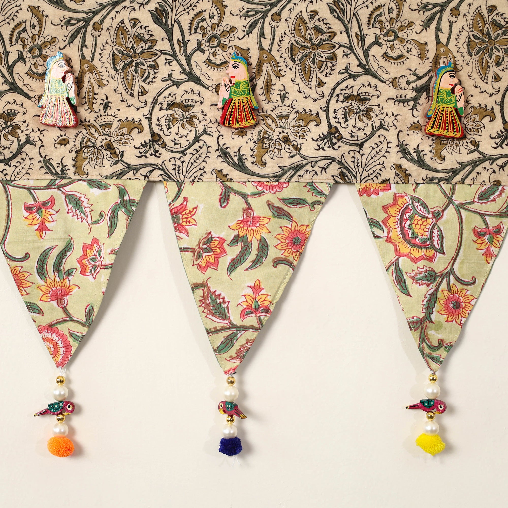 Welcome your guests with a touch of tradition! This handmade toran for door decoration. Adorned with intricate gota patti, pom pom, and shell work. Torans have been used in Indian decor for centuries, symbolizing auspiciousness. This toran is crafted with care, adding charm and elegance to any space.