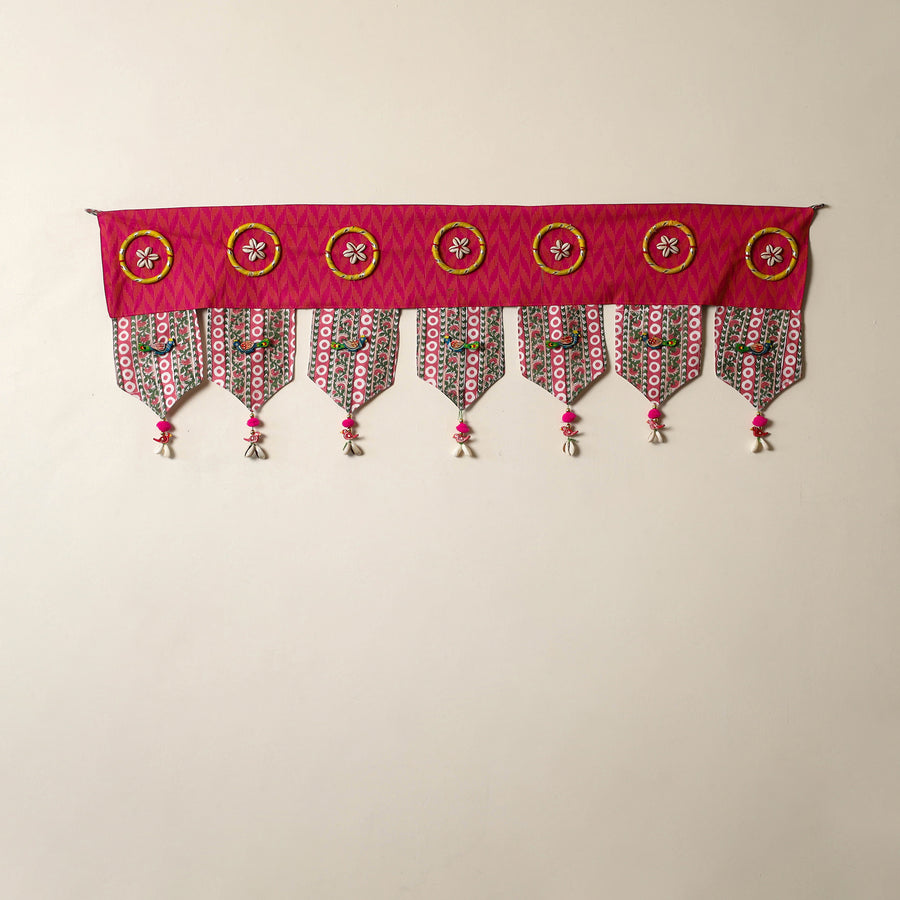 Welcome your guests with a touch of tradition! This handmade toran for door decoration. Adorned with intricate gota patti, pom pom, and shell work. Torans have been used in Indian decor for centuries, symbolizing auspiciousness. This toran is crafted with care, adding charm and elegance to any space.