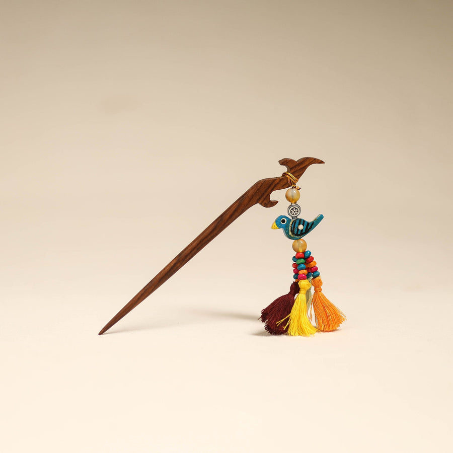 Handmade juda stick adds a graceful touch to your hairstyle. Made with a wooden base, it features intricate artisan-made details that may include beads, thread work, hand-painted bird or other decorative elements, reflecting the unique creativity of the maker.