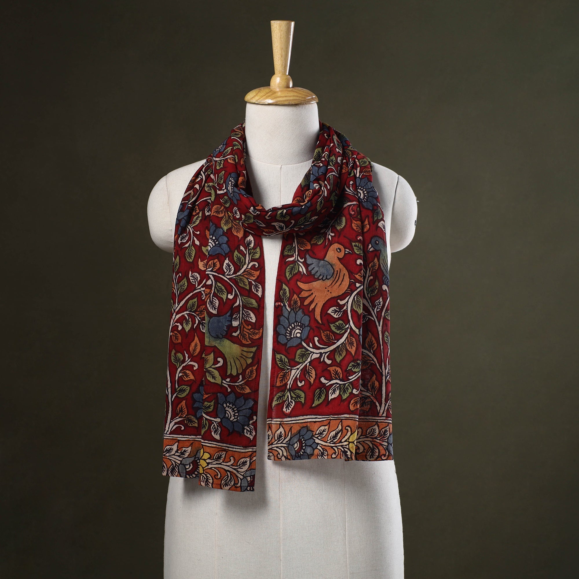 This red cotton hand-painted 'Bamboo Kalam' Kalamkari stole adds a distinctive charm to your wardrobe. Featuring freehand drawings and dyed using natural colours, it celebrates the artistry of kalamkari, a craft rooted in Andhra Pradesh. Each piece is created by skilled artisans and reflects the richness of Indian textile heritage. Ideal for festive occasions or everyday styling, it pairs beautifully with a kurta or dress to bring a touch of handcrafted elegance.