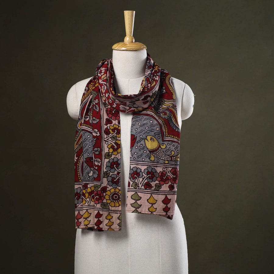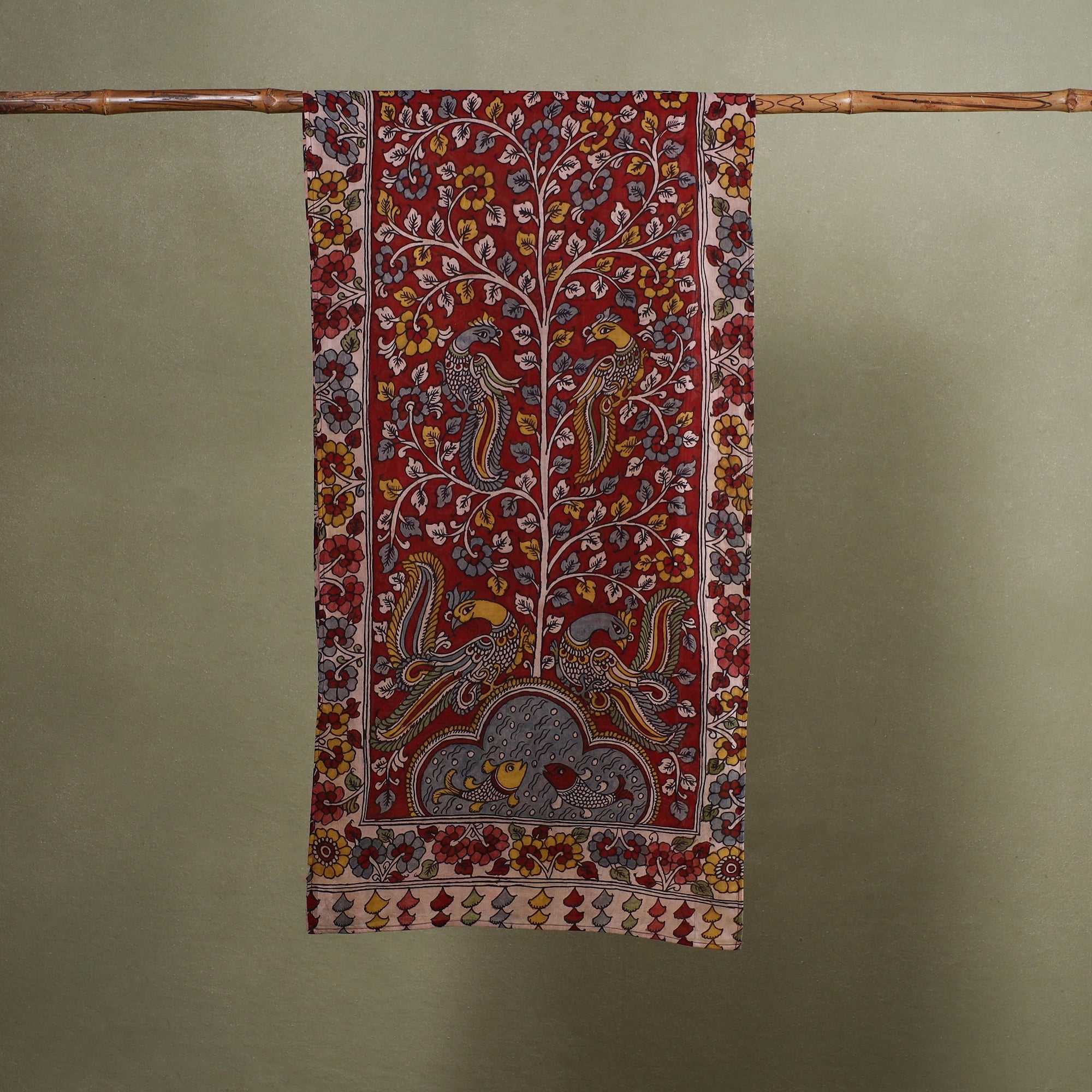 This red cotton hand-painted 'Bamboo Kalam' Kalamkari stole adds a distinctive charm to your wardrobe. Featuring freehand drawings and dyed using natural colours, it celebrates the artistry of kalamkari, a craft rooted in Andhra Pradesh. Each piece is created by skilled artisans and reflects the richness of Indian textile heritage. Ideal for festive occasions or everyday styling, it pairs beautifully with a kurta or dress to bring a touch of handcrafted elegance.