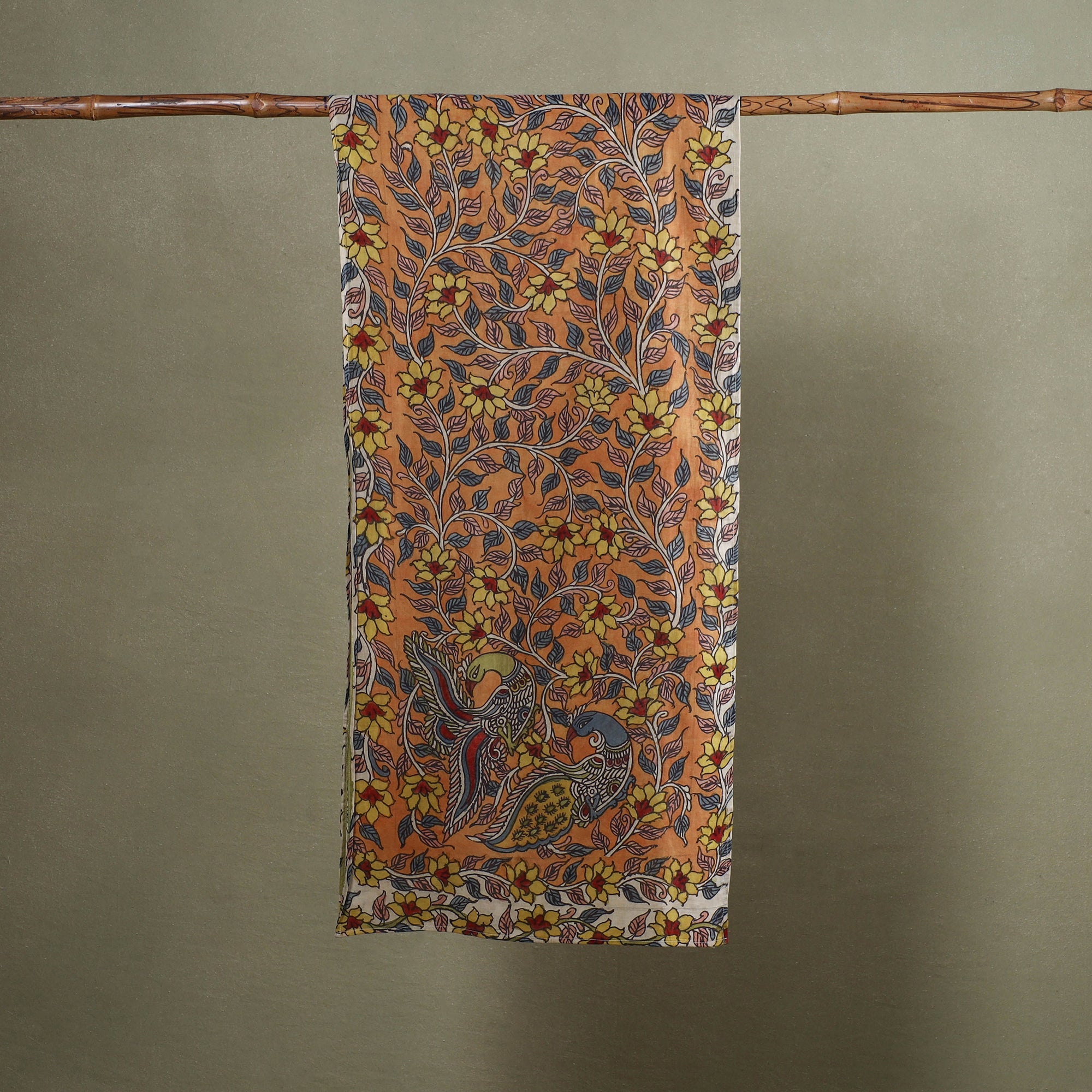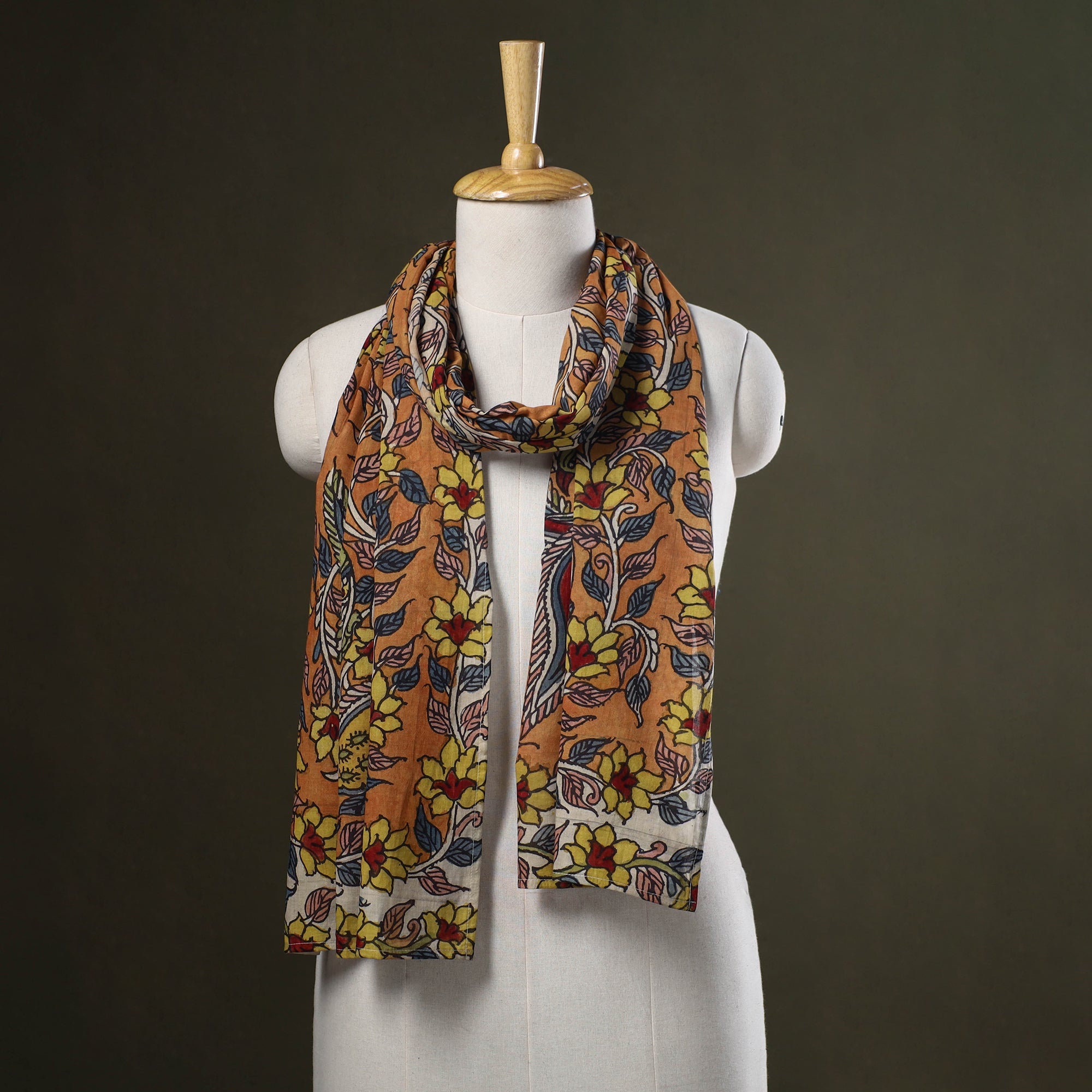 This orange cotton hand-painted 'Bamboo Kalam' Kalamkari stole adds a distinctive charm to your wardrobe. Featuring freehand drawings and dyed using natural colours, it celebrates the artistry of kalamkari, a craft rooted in Andhra Pradesh. Each piece is created by skilled artisans and reflects the richness of Indian textile heritage. Ideal for festive occasions or everyday styling, it pairs beautifully with a kurta or dress to bring a touch of handcrafted elegance.