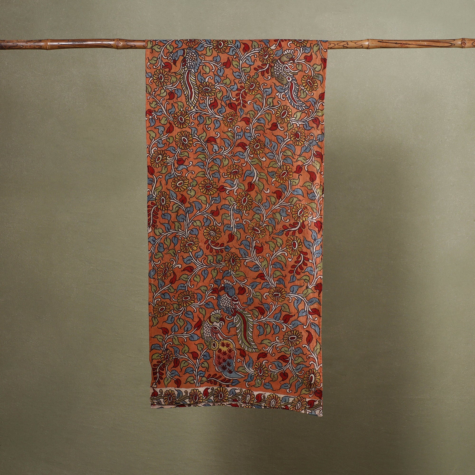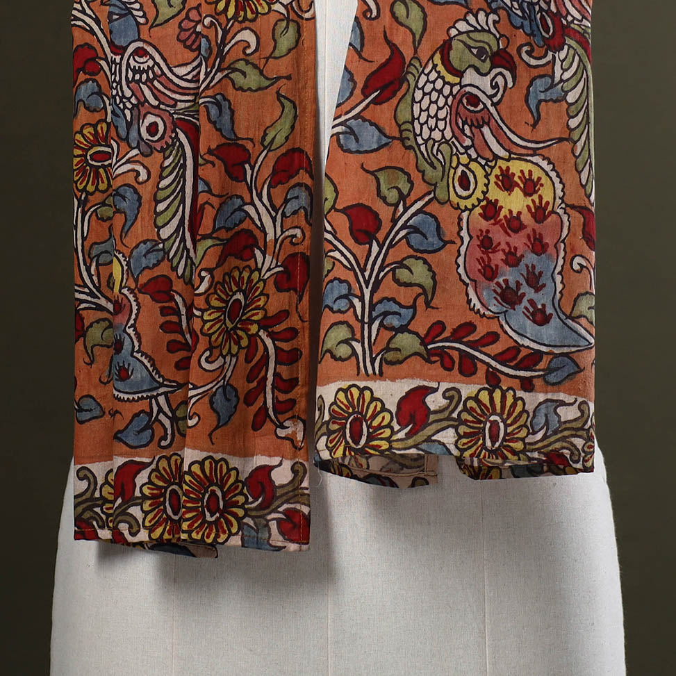 This orangecotton hand-painted 'Bamboo Kalam' Kalamkari stole adds a distinctive charm to your wardrobe. Featuring freehand drawings and dyed using natural colours, it celebrates the artistry of kalamkari, a craft rooted in Andhra Pradesh. Each piece is created by skilled artisans and reflects the richness of Indian textile heritage. Ideal for festive occasions or everyday styling, it pairs beautifully with a kurta or dress to bring a touch of handcrafted elegance.