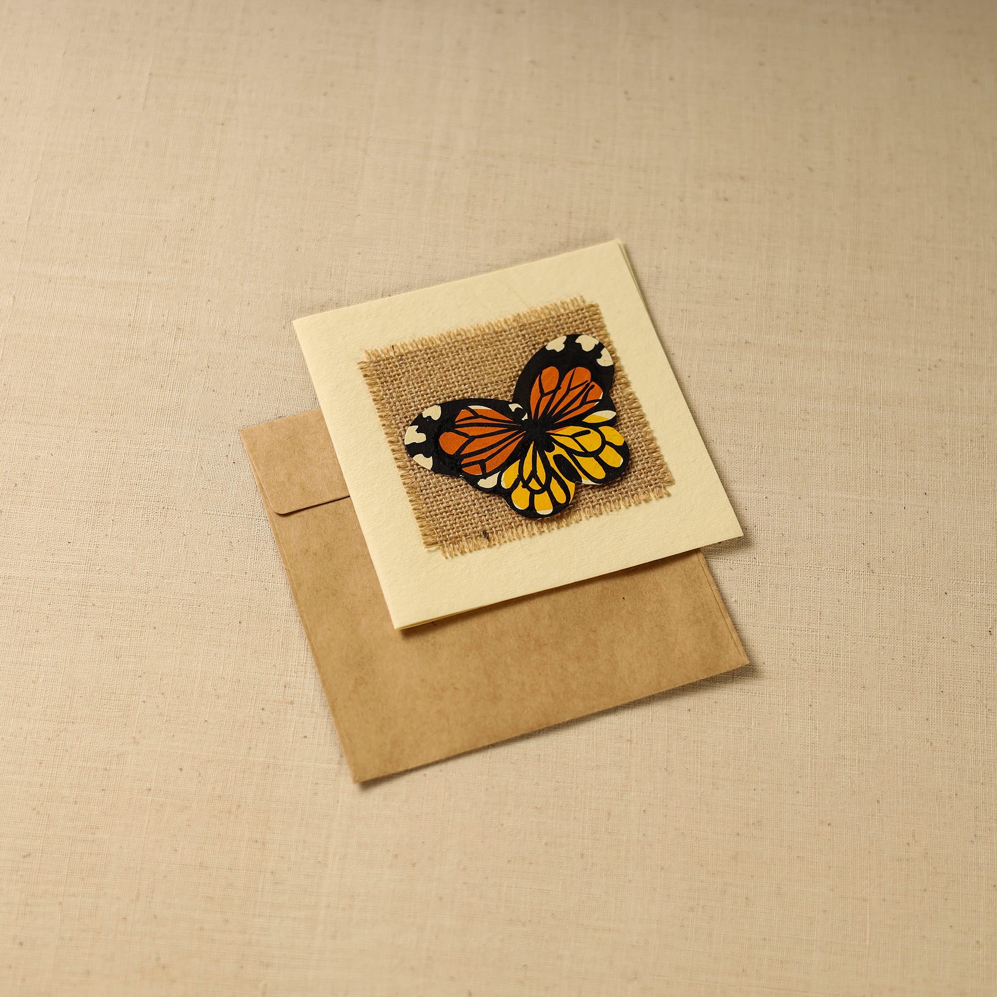 This elegant greeting card is crafted from handmade paper and features a decorative layer of jute and paper adorned with a hand-painted design. Made by artisans, it comes with a matching envelope and is ideal for expressing warm wishes, thank-you notes, or personal messages with grace and thoughtfulness.
