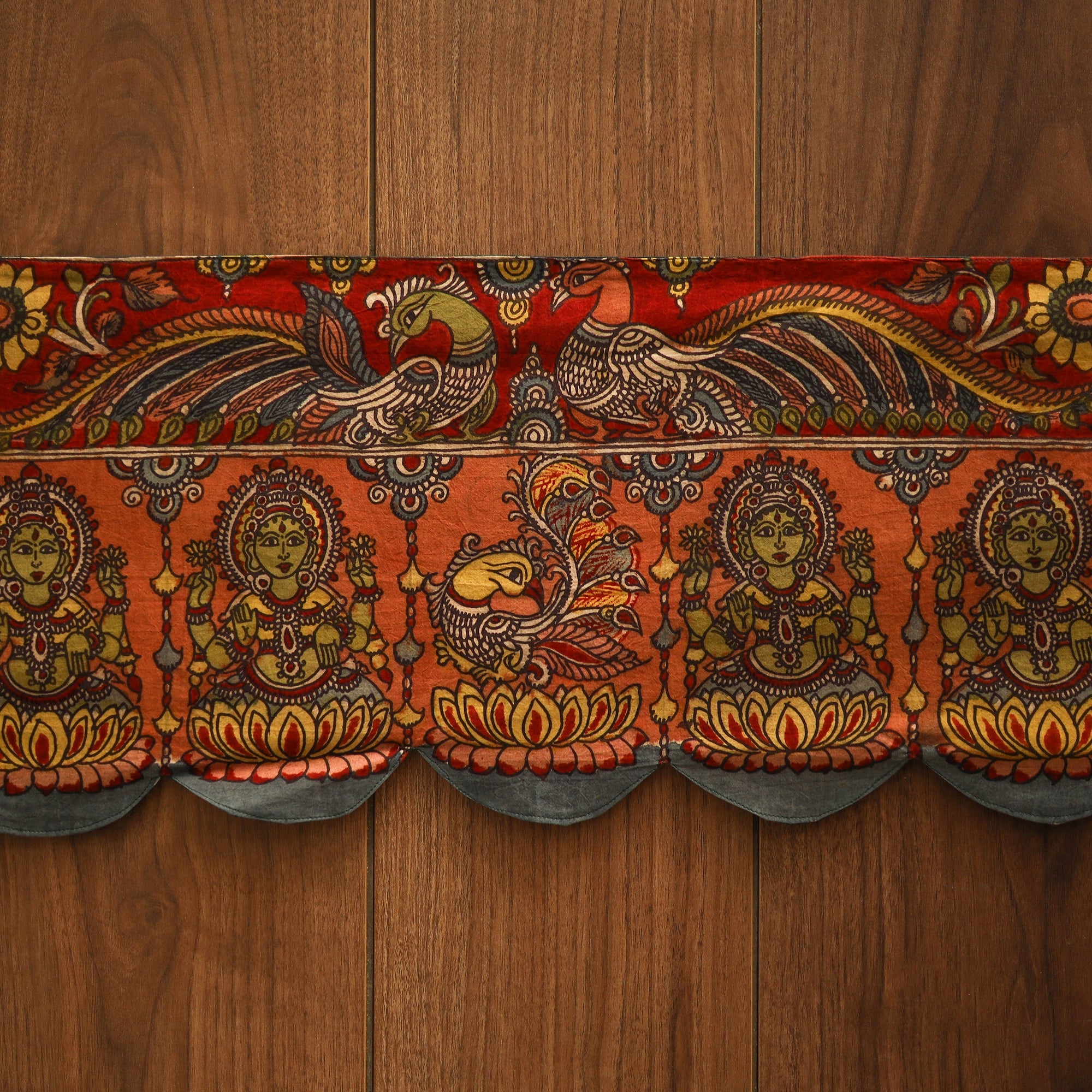 Experience heritage artistry this handpainted kalamkari pen work cotton ashtalakshmi toran, crafted in the srikalahasti style where artists use a “kalam” (pen) for freehand drawing and natural colors filling. Practiced for over 200 years, this tradition preserves age-old dyeing methods passed down through generations. Slight color spread or minor irregularities highlight its handmade charm. Perfect for adorning doorways, pooja spaces, or festive occasions, this toran brings timeless artistry and cultural heritage into your home.