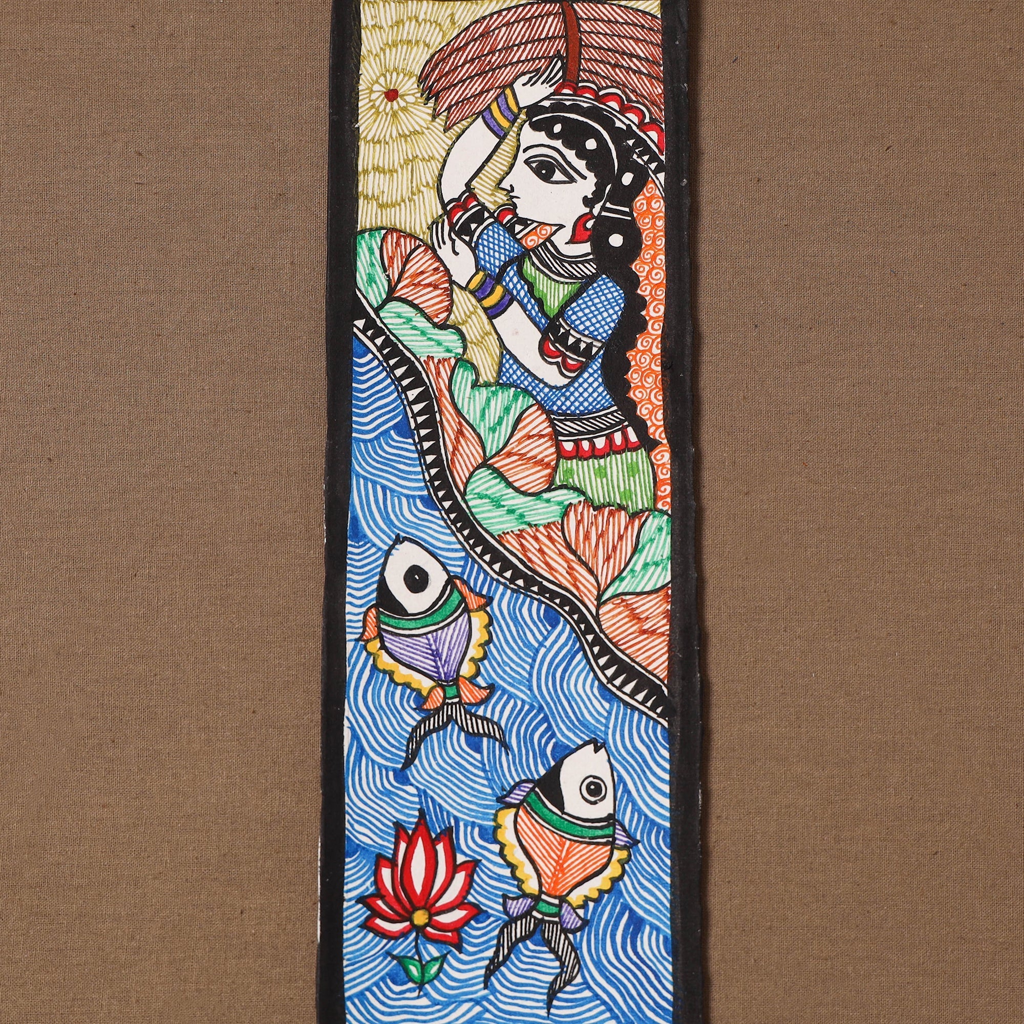 Handpainted handmade paper using natural colors and permanent ink Madhubani painting by master artisan Hira Devi from Bihar, reflecting the depth and beauty of the region’s artistic heritage. Madhubani painting, also known as Mithila art, is one of India’s most celebrated traditional art forms, known for its intricate lines, vibrant motifs, and storytelling inspired by nature and mythology. In this art, artists traditionally use fingers, twigs, and matchstick-like tools to create detailed patterns.