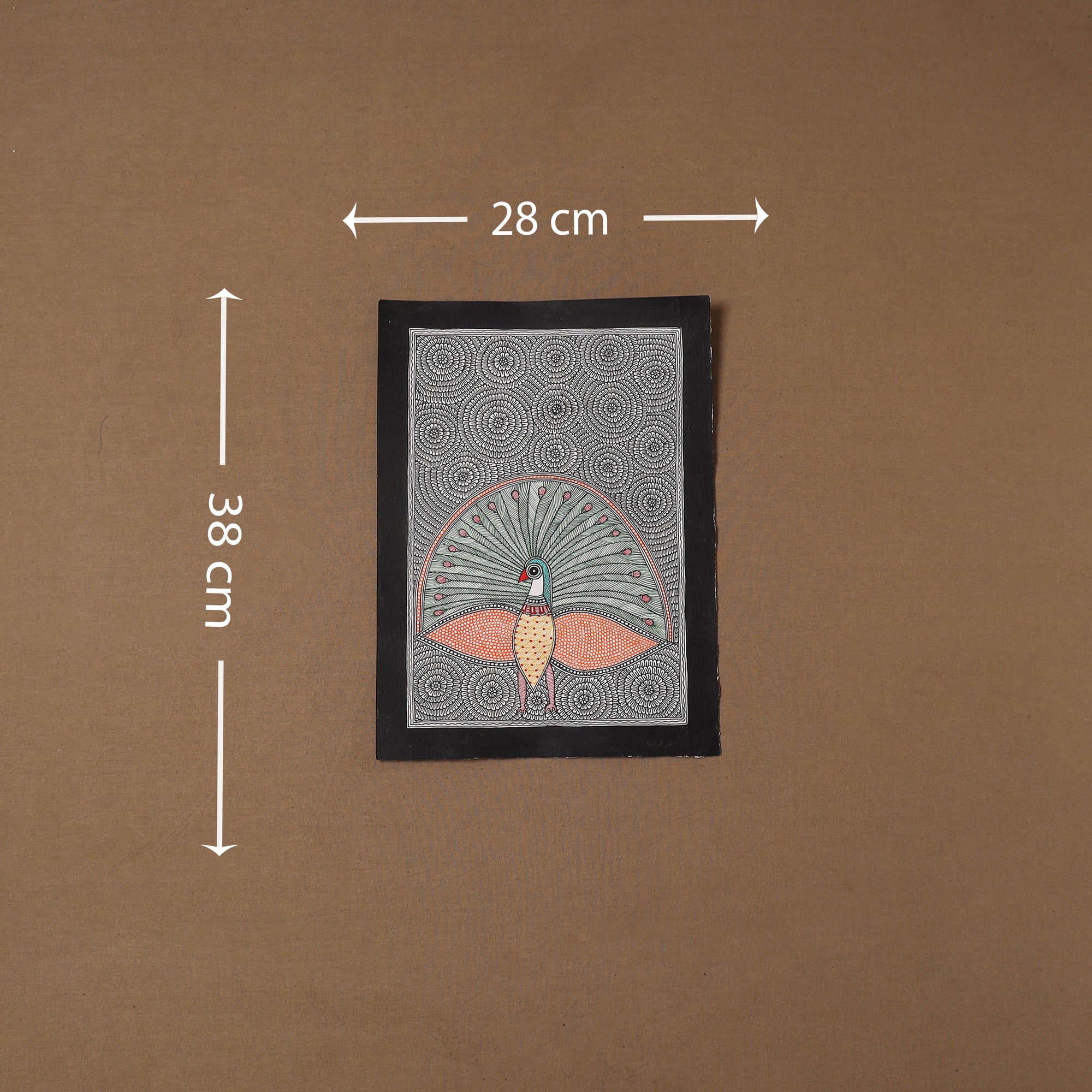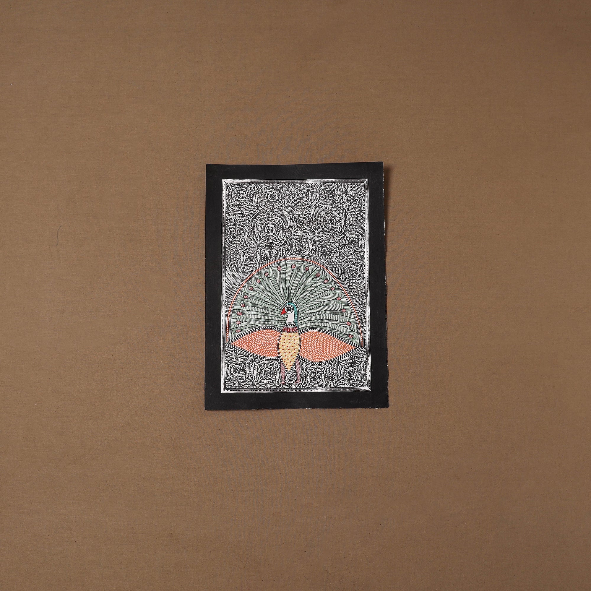 Handpainted handmade paper using natural colors and permanent ink Madhubani painting by master artisan Hira Devi from Bihar, reflecting the depth and beauty of the region’s artistic heritage. Madhubani painting, also known as Mithila art, is one of India’s most celebrated traditional art forms, known for its intricate lines, vibrant motifs, and storytelling inspired by nature and mythology. In this art, artists traditionally use fingers, twigs, and matchstick-like tools to create detailed patterns.