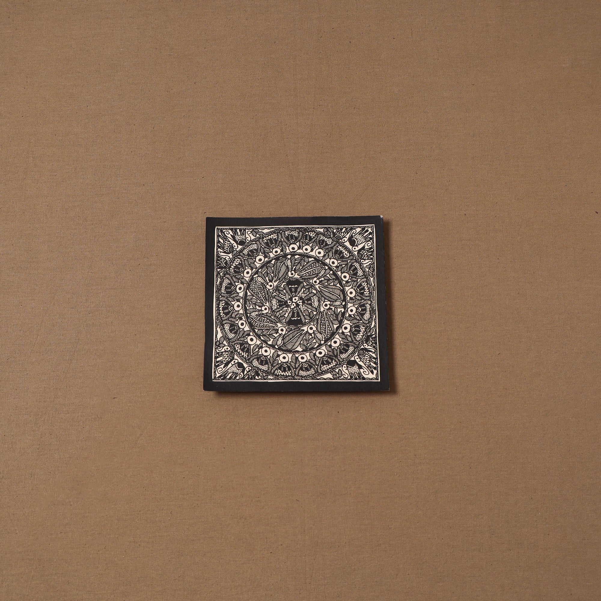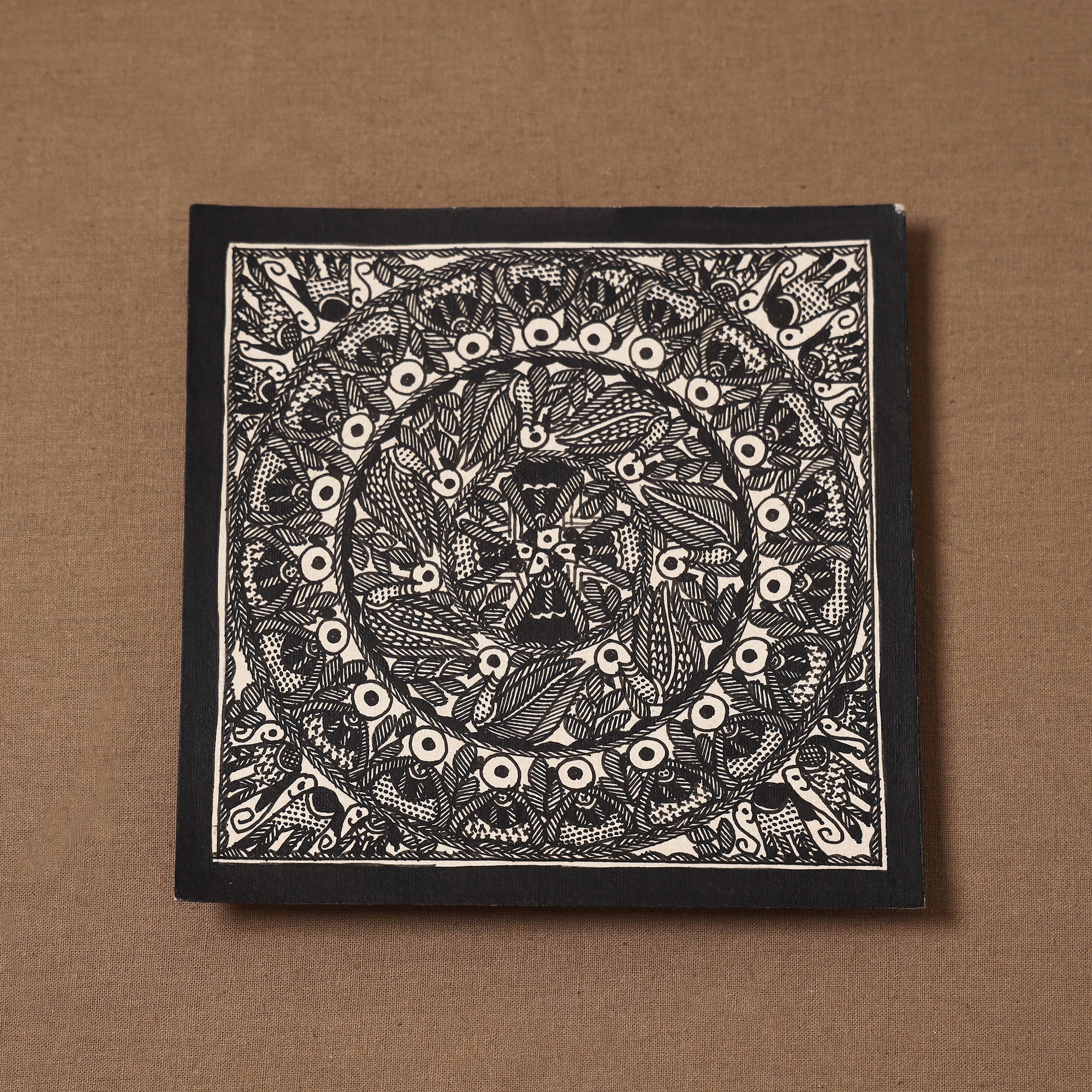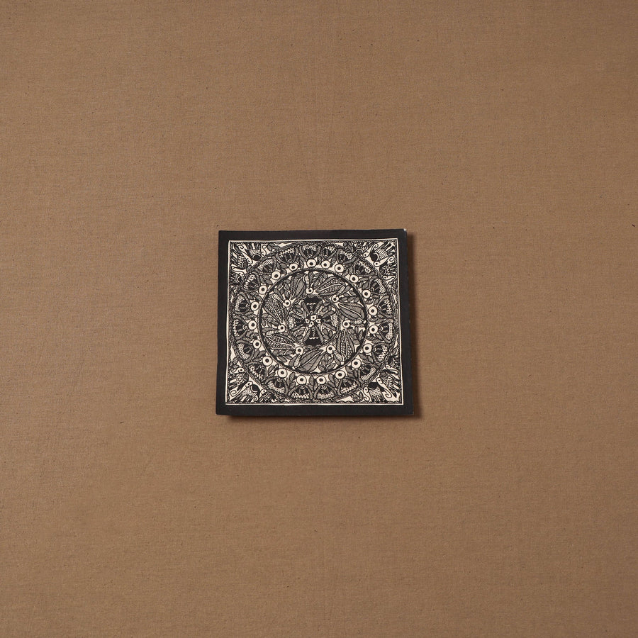 Handpainted handmade paper using natural colors and permanent ink Madhubani painting by master artisan Hira Devi from Bihar, reflecting the depth and beauty of the region’s artistic heritage. Madhubani painting, also known as Mithila art, is one of India’s most celebrated traditional art forms, known for its intricate lines, vibrant motifs, and storytelling inspired by nature and mythology. In this art, artists traditionally use fingers, twigs, and matchstick-like tools to create detailed patterns.