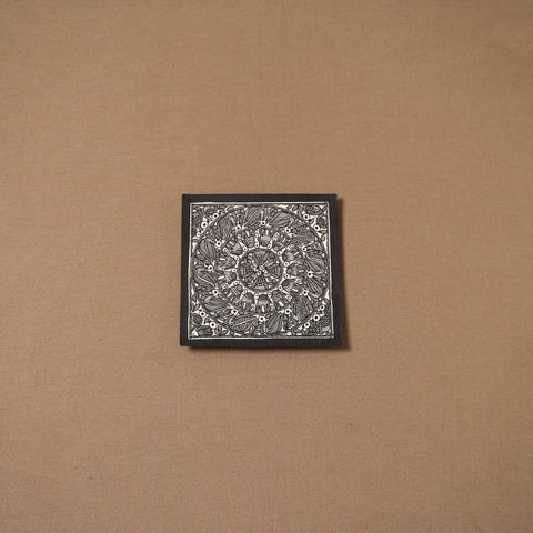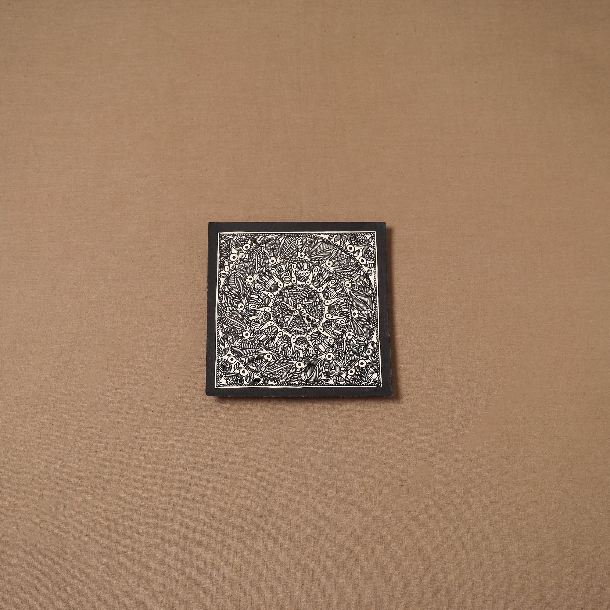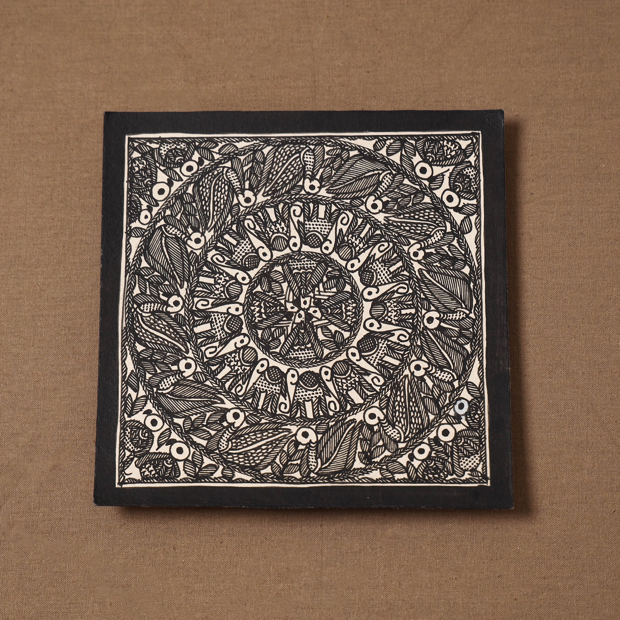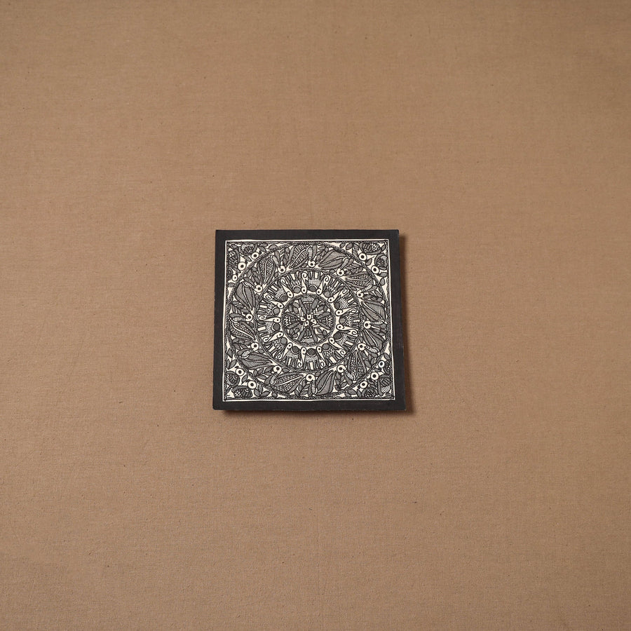 Handpainted handmade paper using natural colors and permanent ink Madhubani painting by master artisan Hira Devi from Bihar, reflecting the depth and beauty of the region’s artistic heritage. Madhubani painting, also known as Mithila art, is one of India’s most celebrated traditional art forms, known for its intricate lines, vibrant motifs, and storytelling inspired by nature and mythology. In this art, artists traditionally use fingers, twigs, and matchstick-like tools to create detailed patterns.
